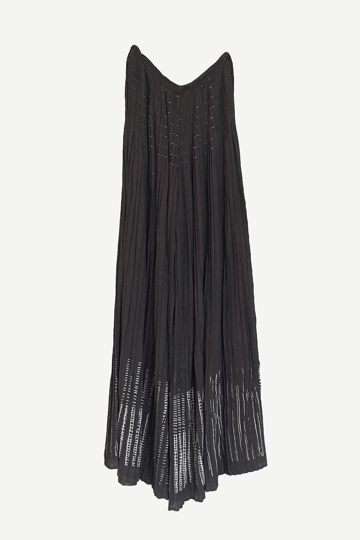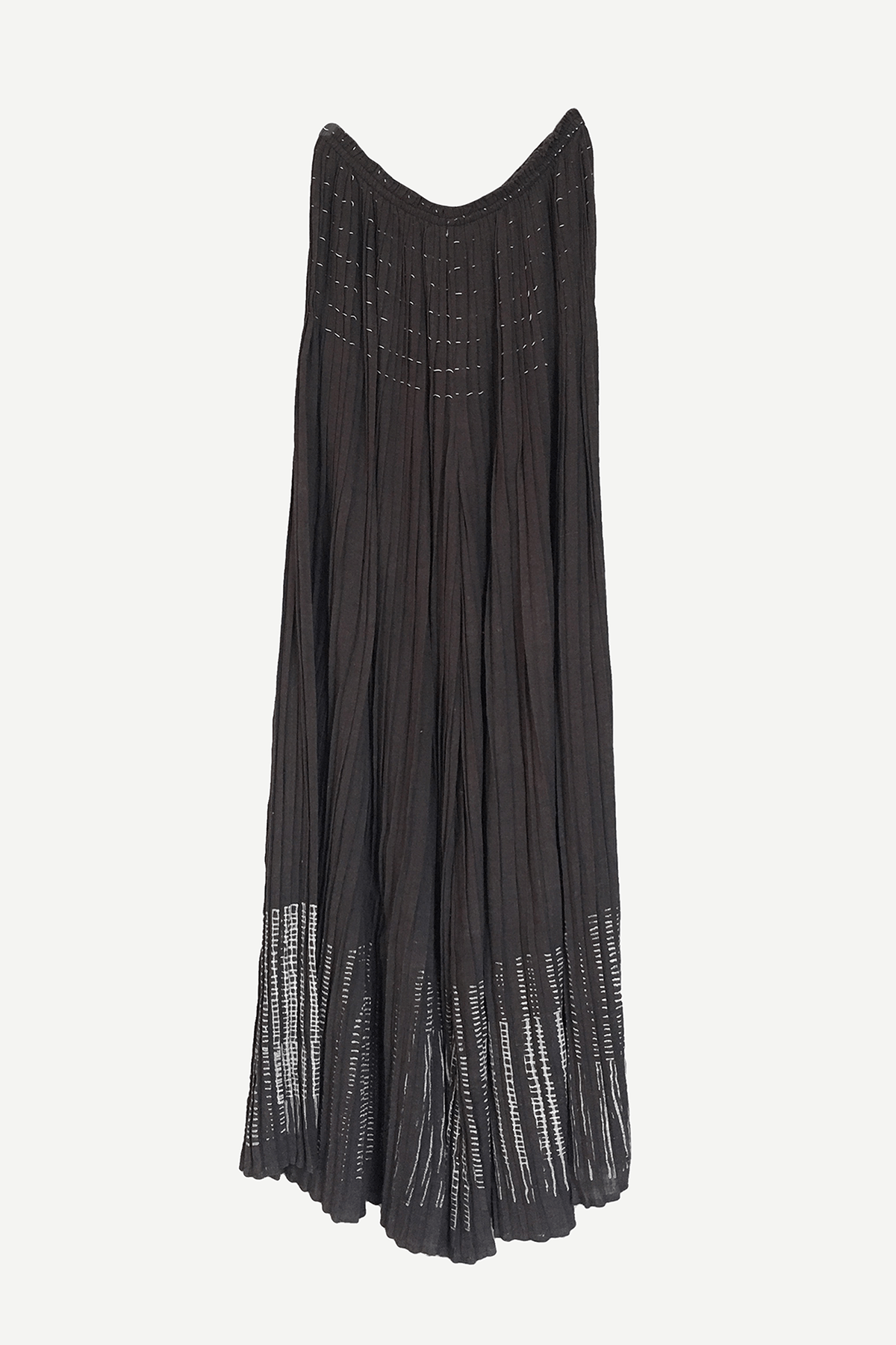 Blockprinted hand done micropleated wide pants in cotton with kantha stitches holding the pleats