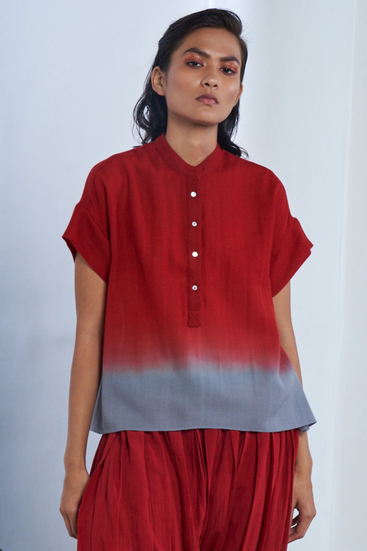 Relaxed anti-fit top in ombré, textured wool wear with relaxed shalwar pants and shibori print jacket