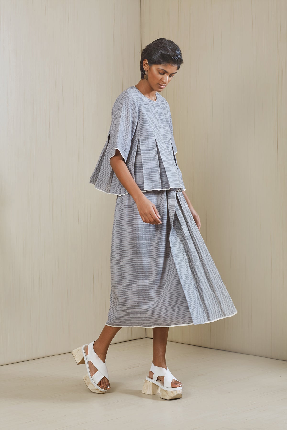Pleated midi skirt in striped handwoven organic cotton pair it with a coordinated pleated top or wear with a t-shirt and blazer