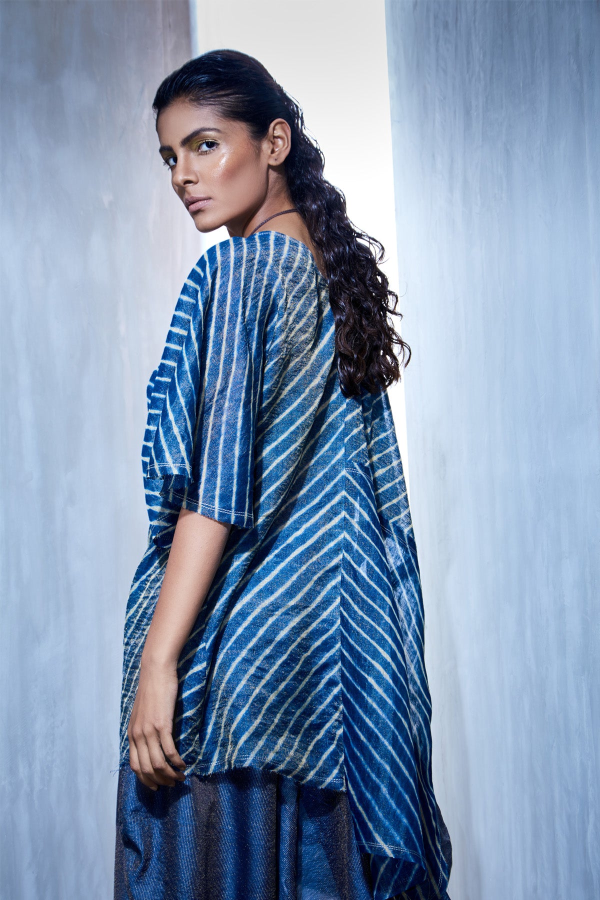 Ruched assymetric top in leheriya printed cotton silk