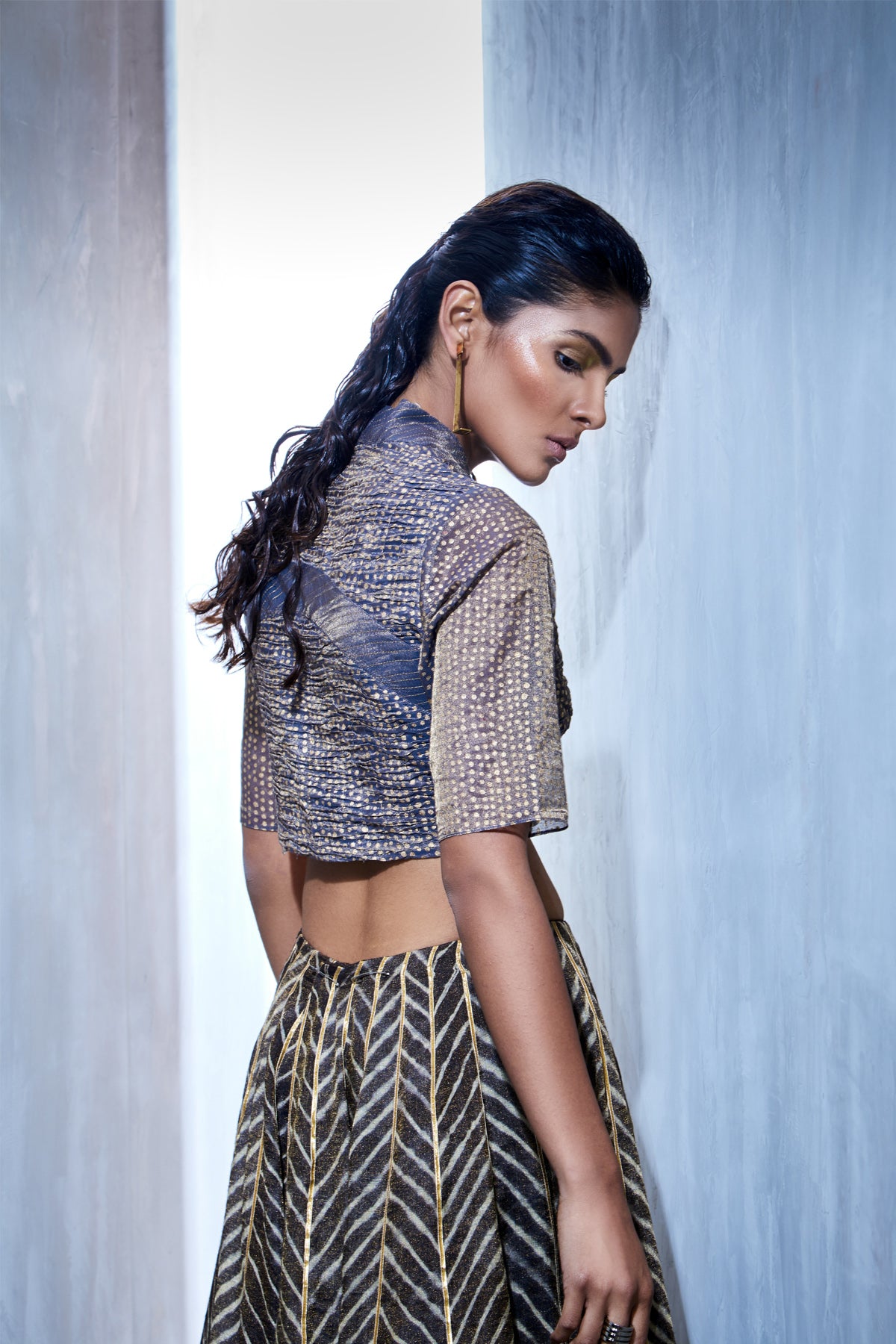 Blockprinted, form-flattering, panelled crop top in cotton silk
