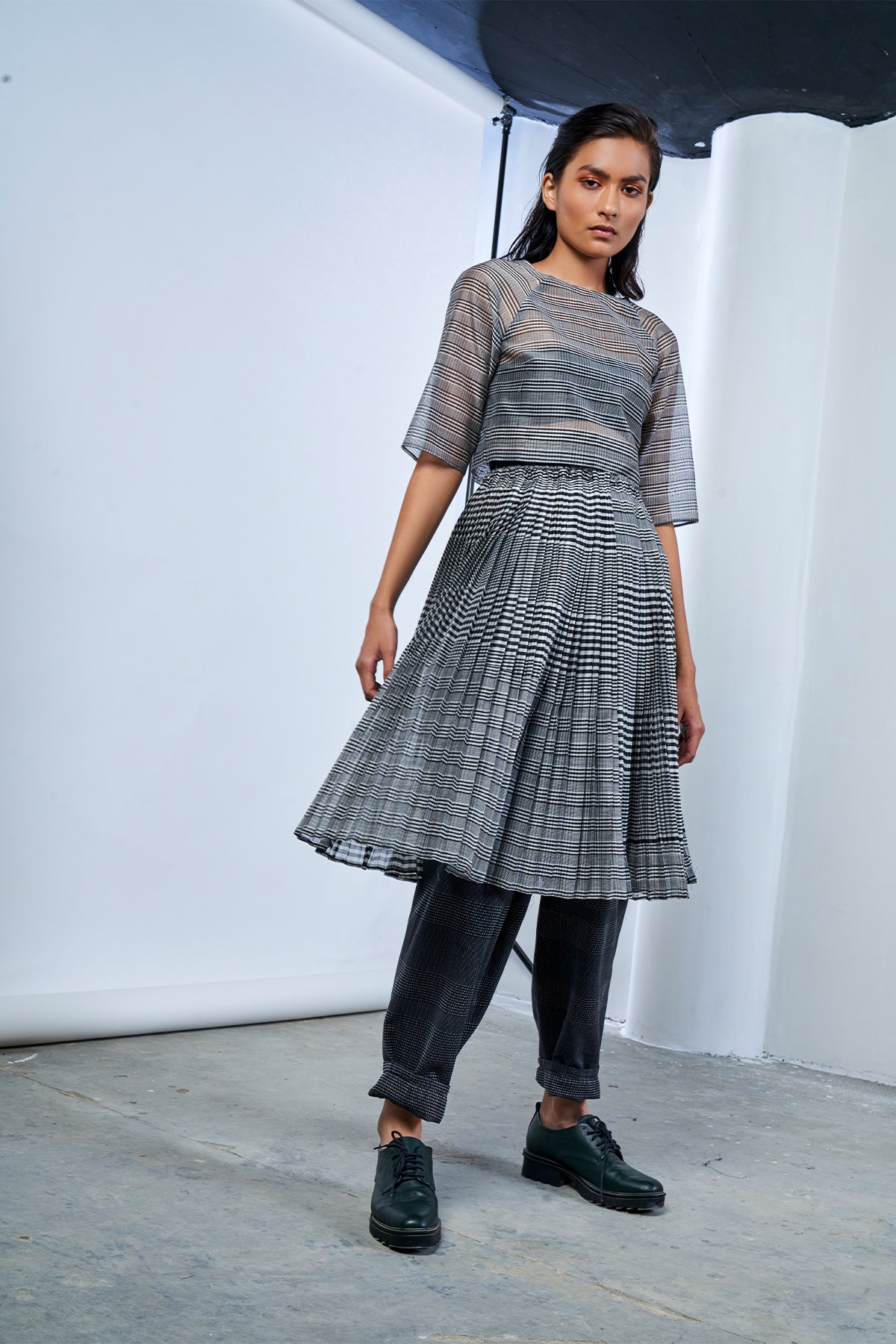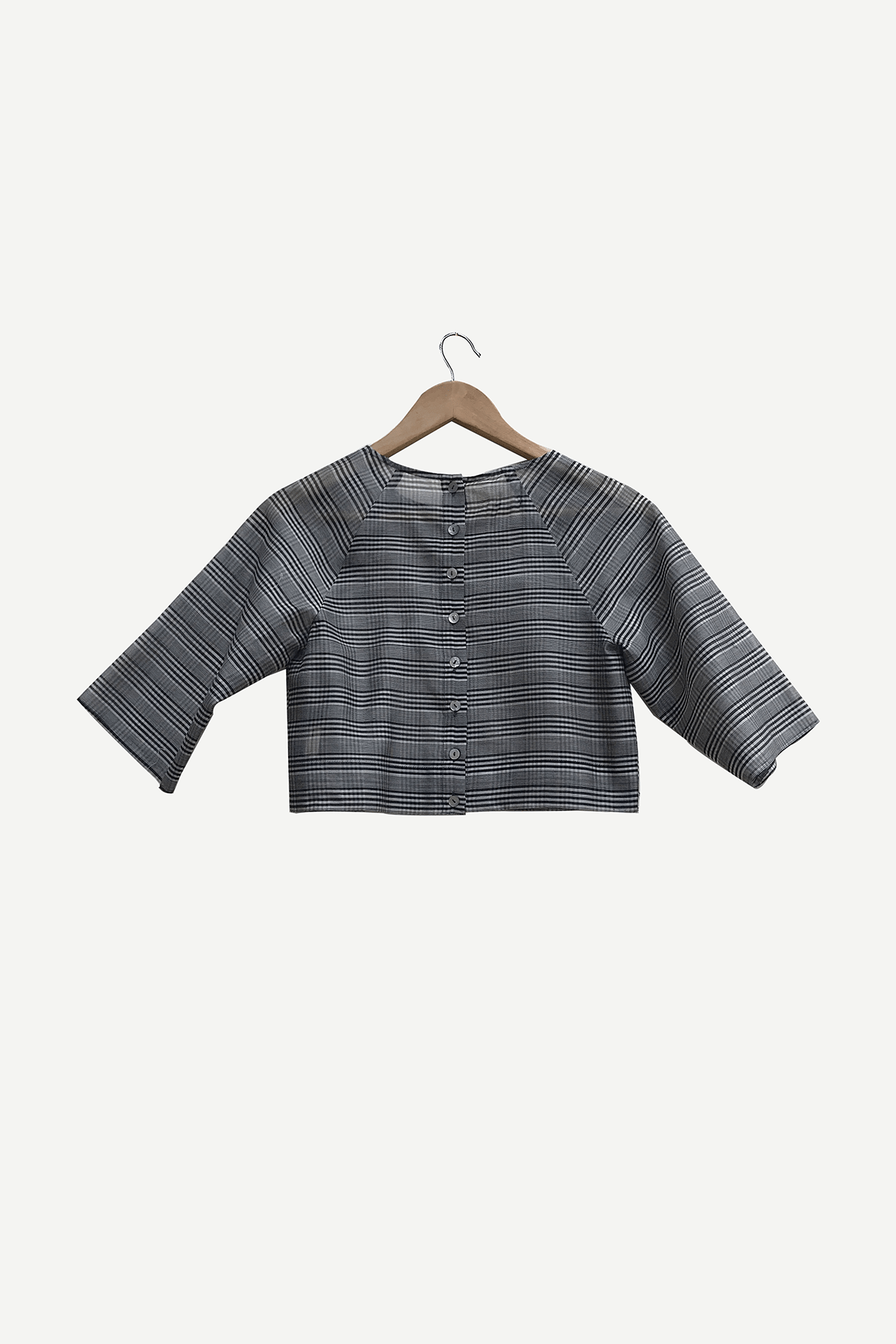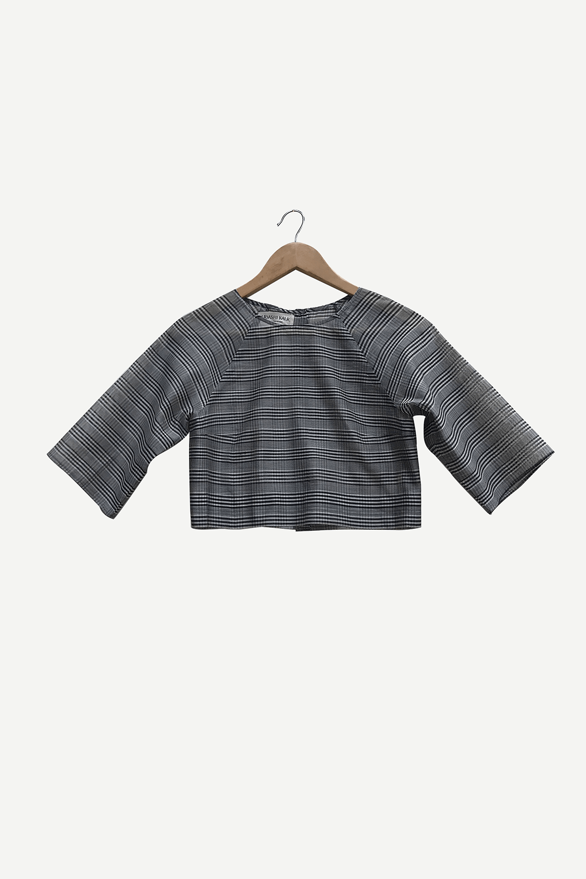 Boxy crop with sheer sleeves in checkered maheshwari silk handwoven by the artisans of maheswar