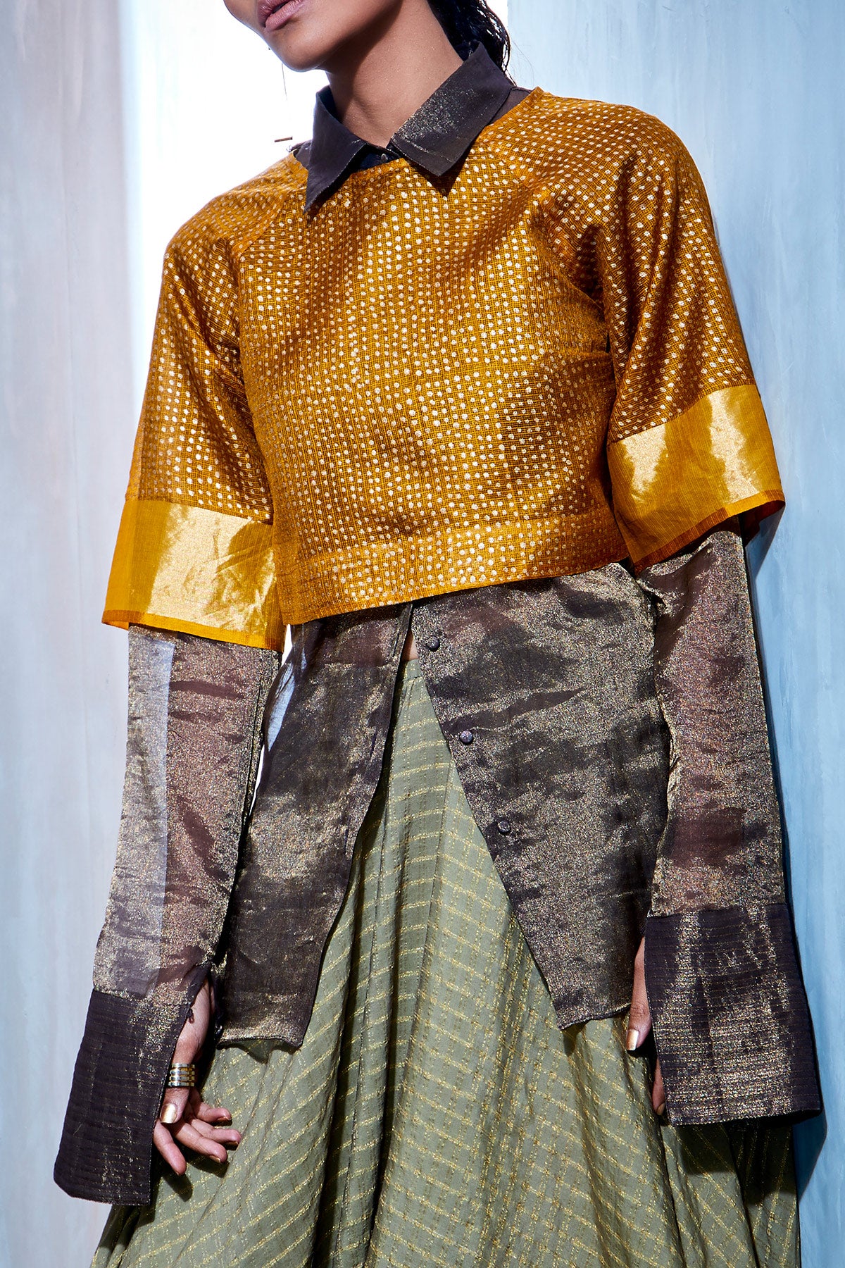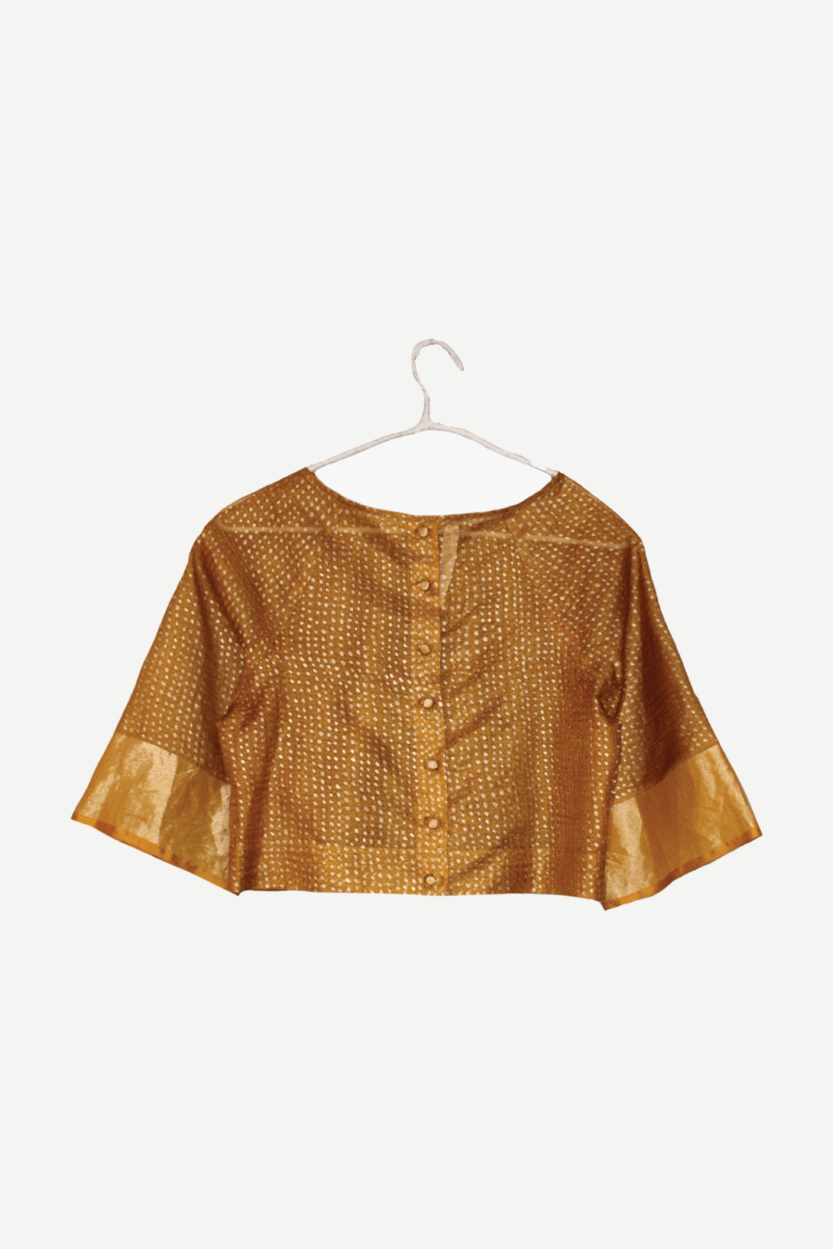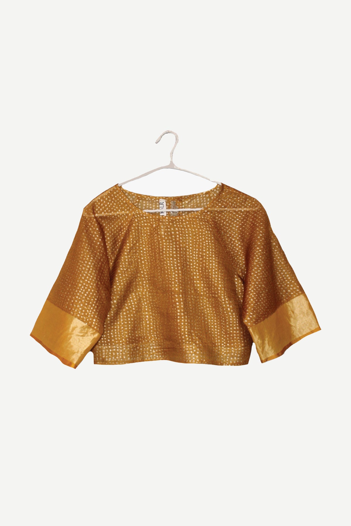 Block printed boxy crop with sheer sleeves in dotted kota silk