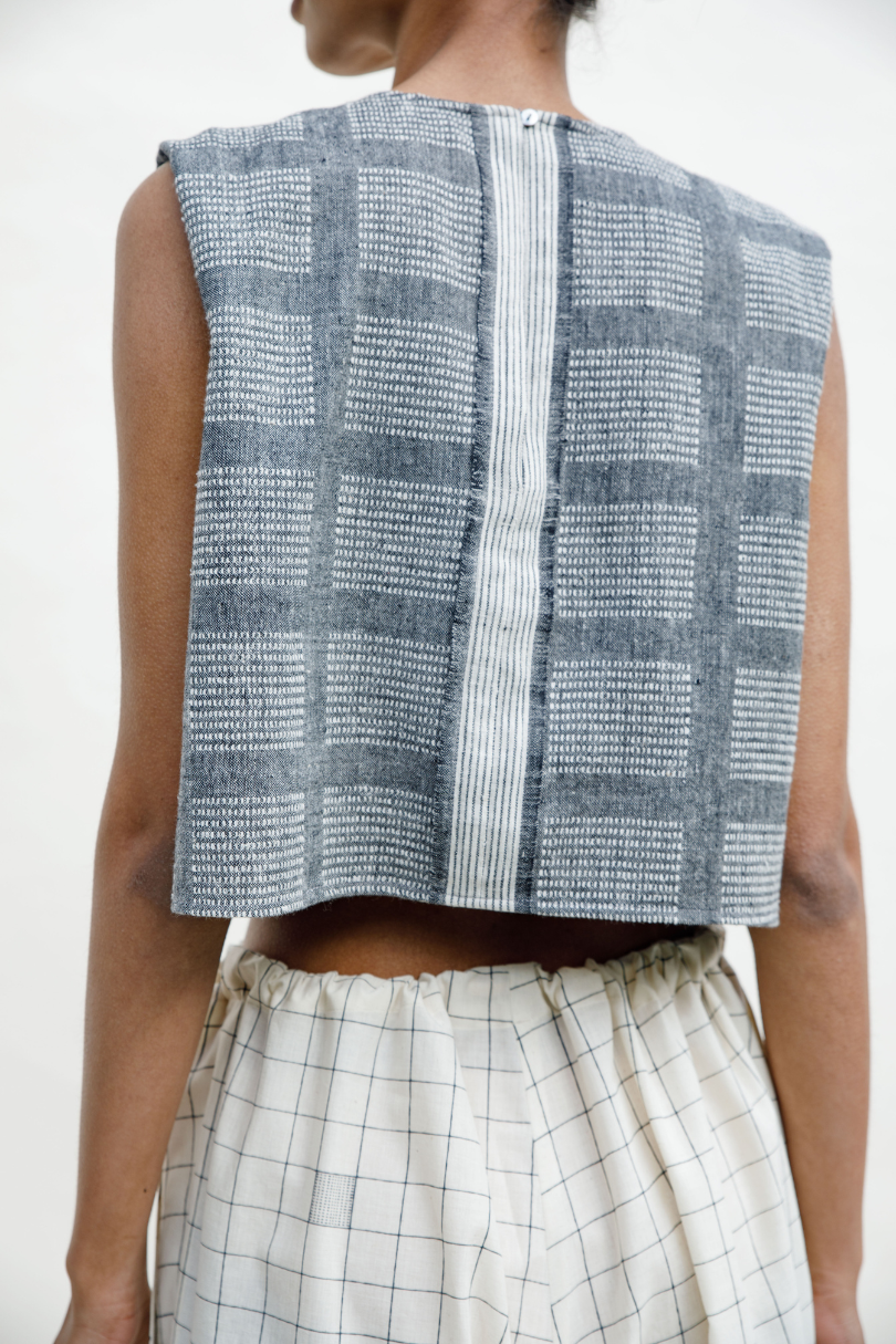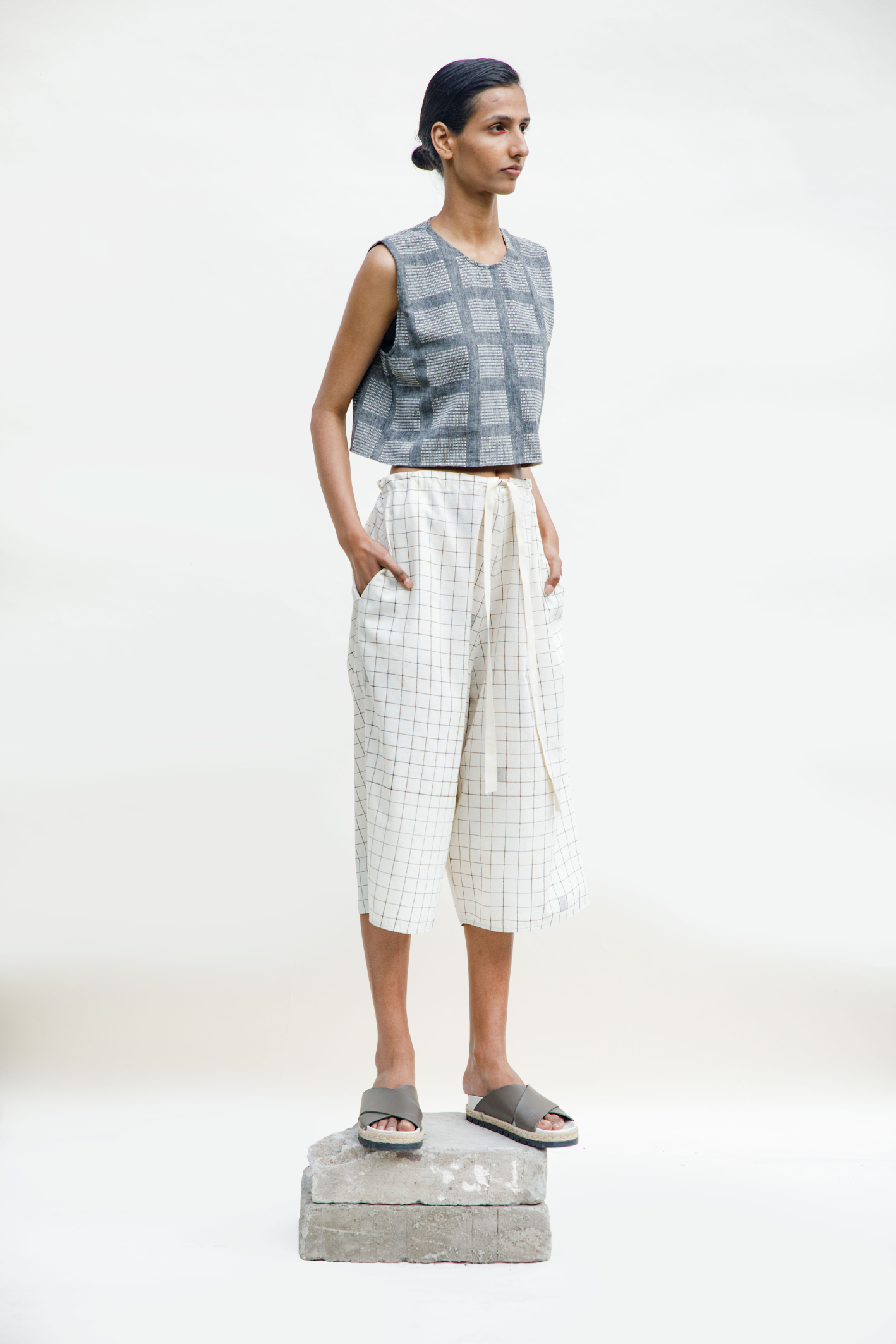 Round neck, check blouse with armhole detail in handloom cotton and linen silk jersey pair it with our check sari and short kimono jacket or style it with easy culottes.