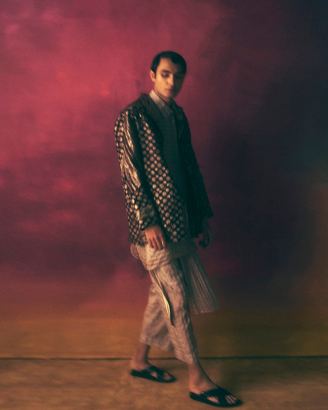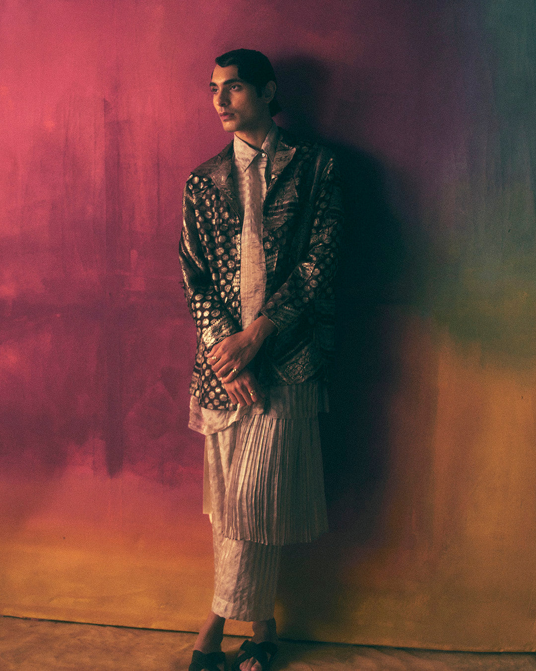 Zero-waste upcycled tailored blazer, patchworked using brocade silk