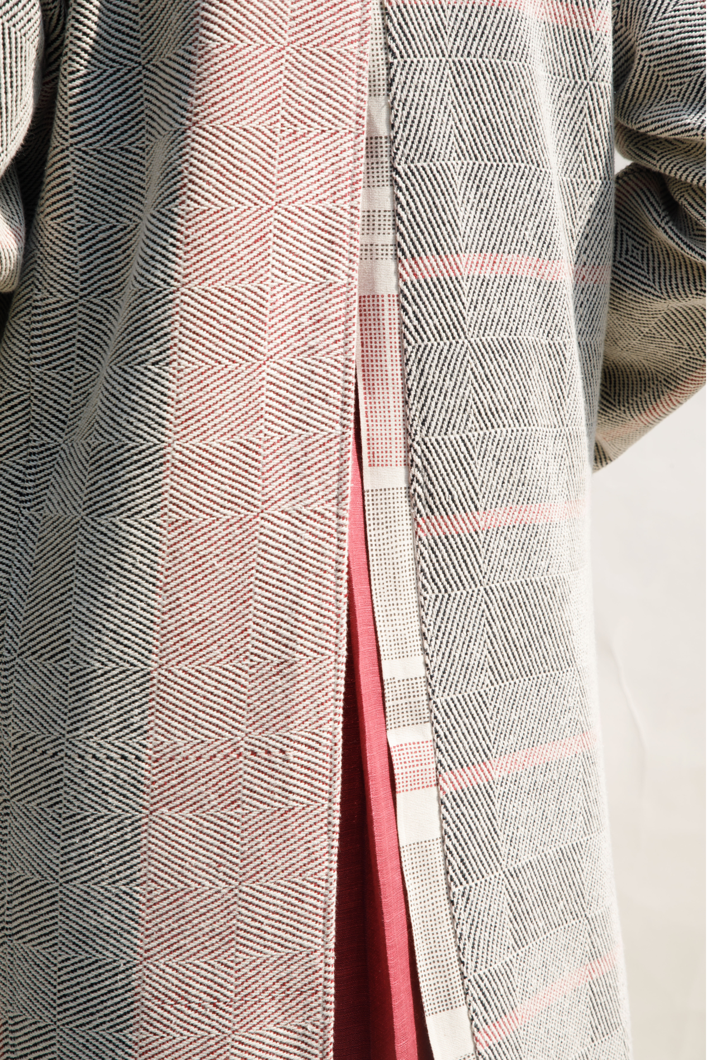 Easy, oversized jacket in handloom cotton with opening at back and block print on tape detail. Layer over a dress or a pair of pants and shirt.