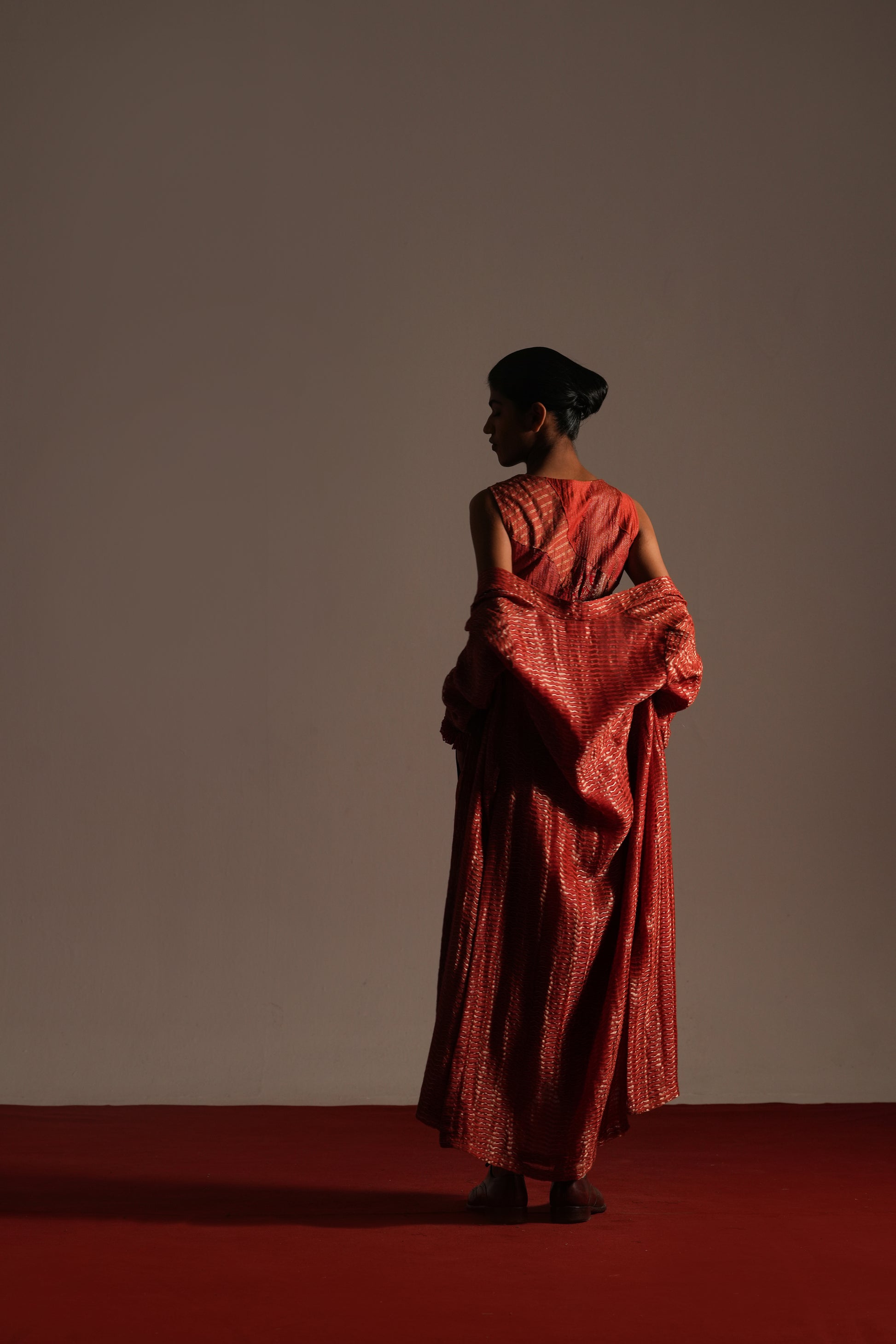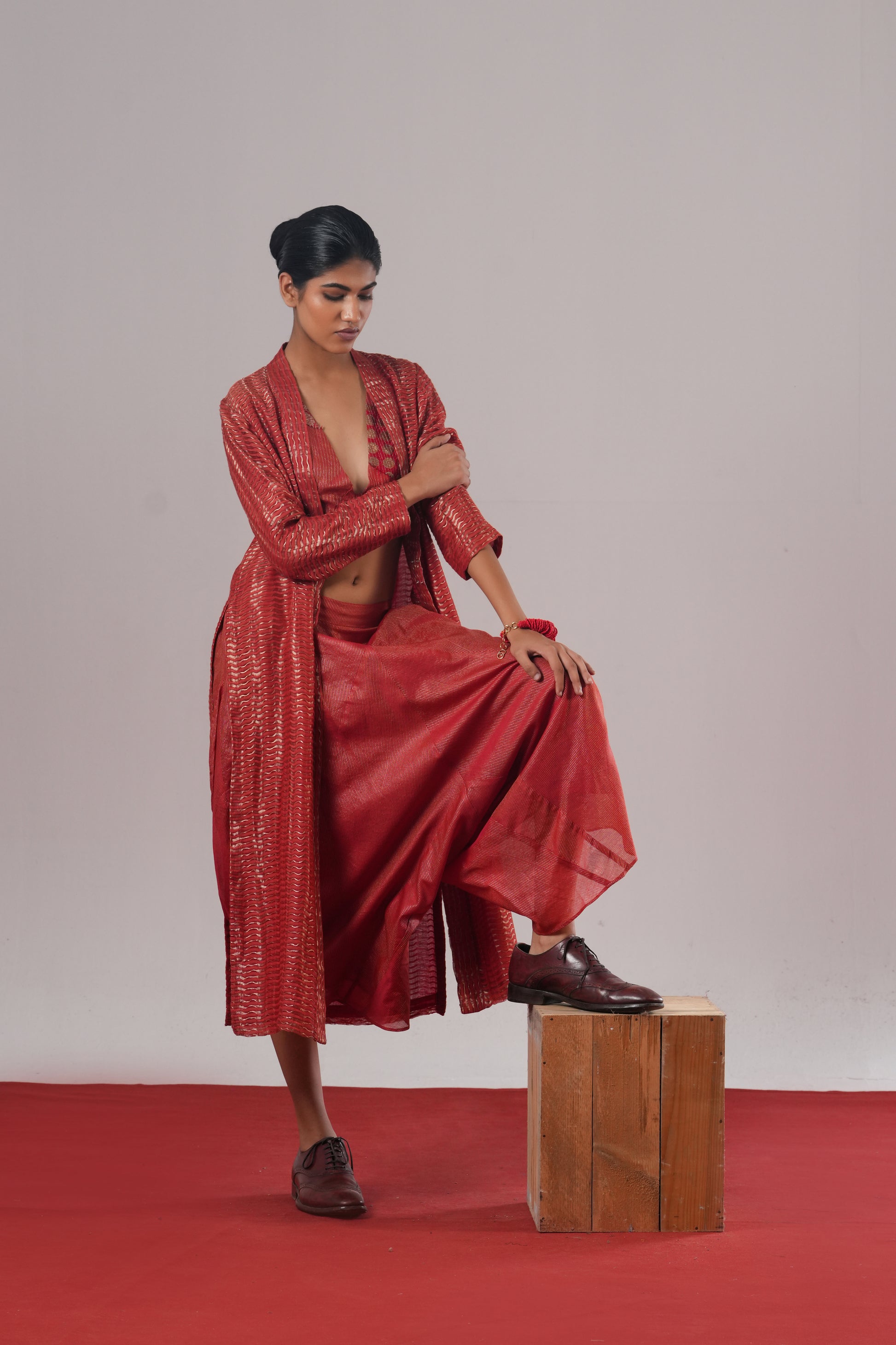 Patched together with fine zari stitch-lines, it bridges sensuality and craft.