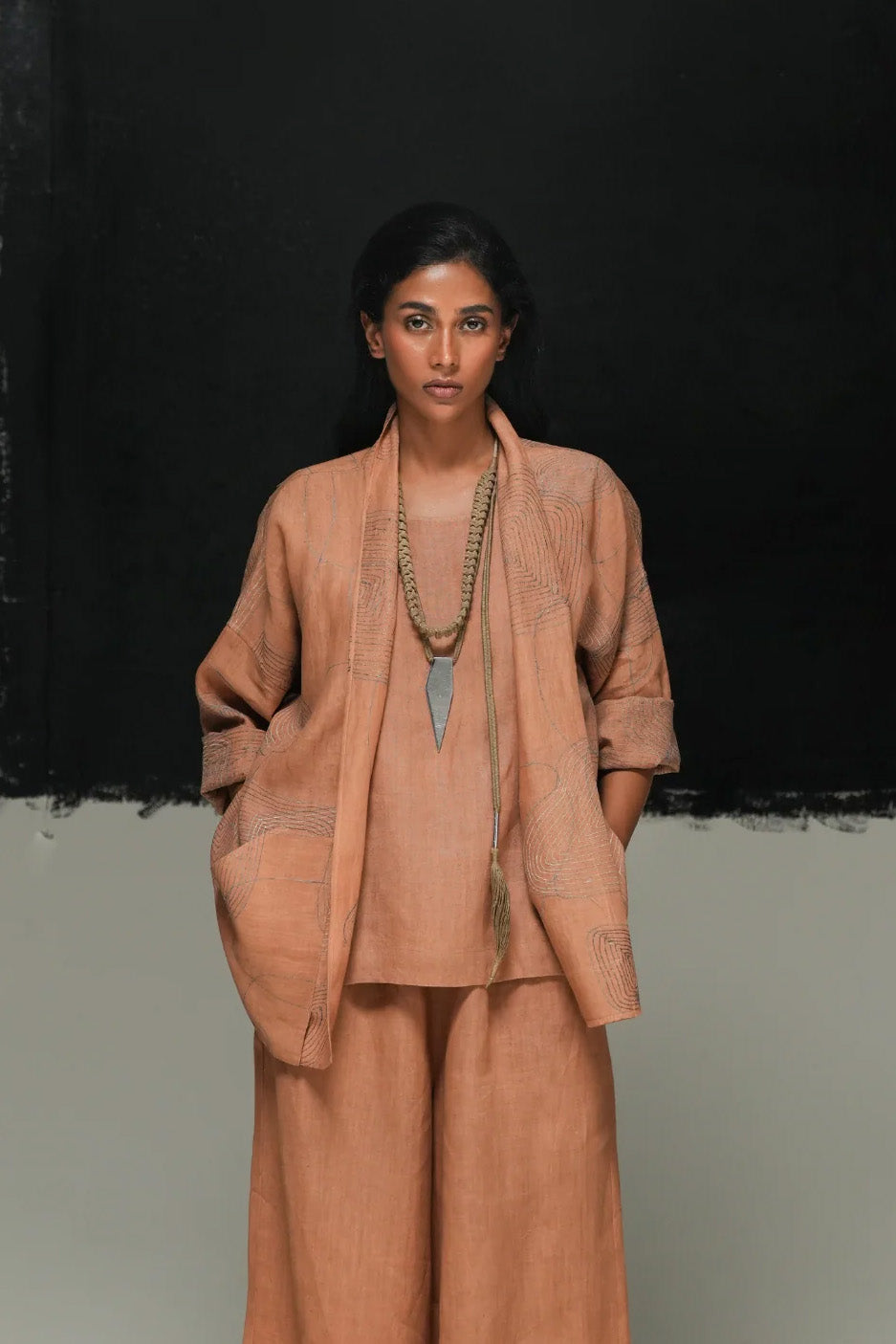 Kimono-style jacket in hand-woven linen and adorned with all-over machine embroidery