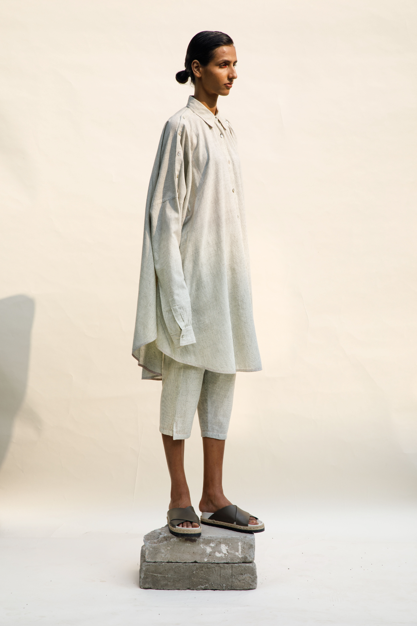 Relaxed, lounge pants in striped handspun cotton wear with our over-sized shirt and layer with an easy collared jacket for a relaxed look.
