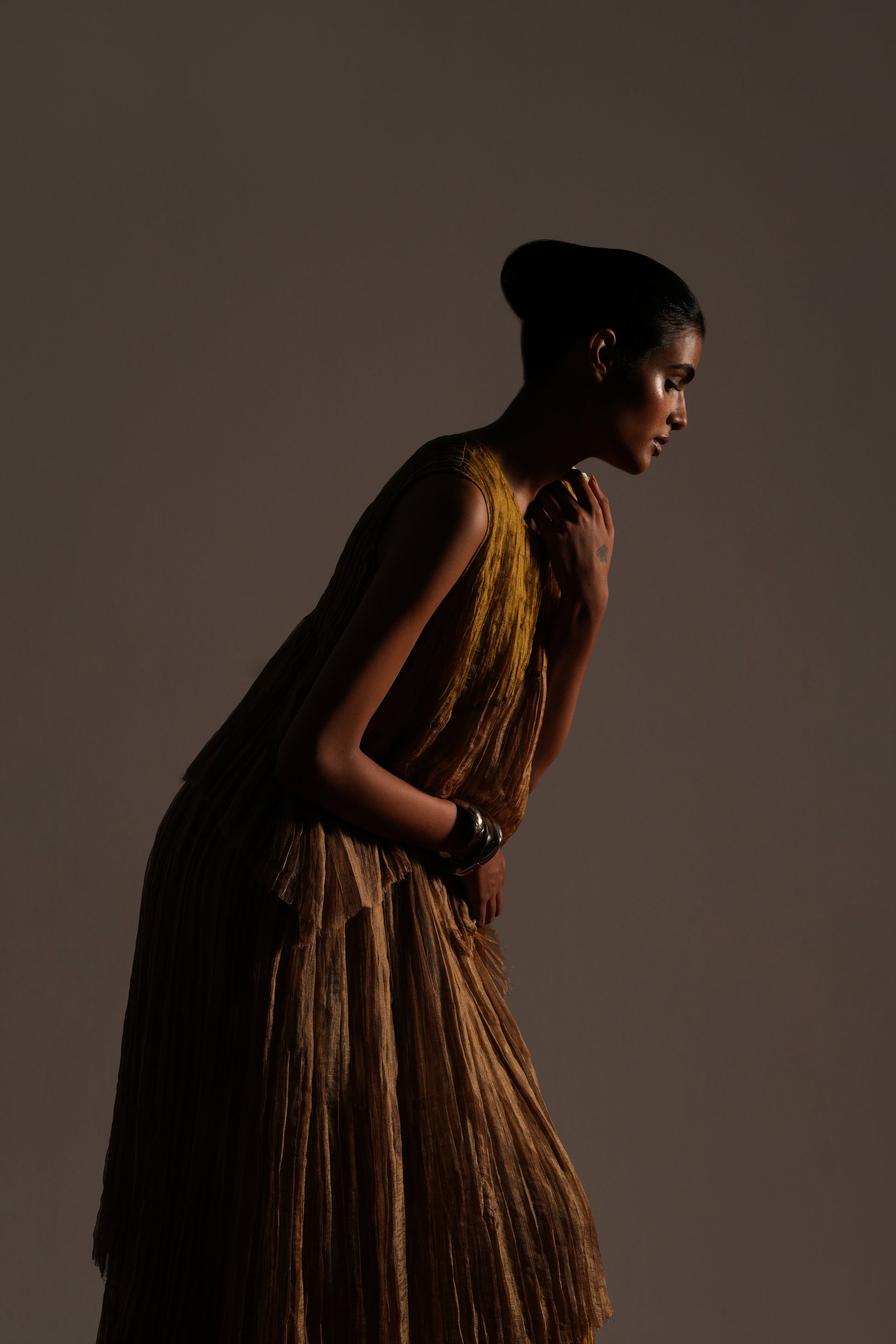 A colour-blocked, knife-pleated asymmetric layered dress crafted in Zari Kota silk. The Kawa Jacket blurs the line between structure and fluidity, offering a sculptural yet effortless silhouette.
