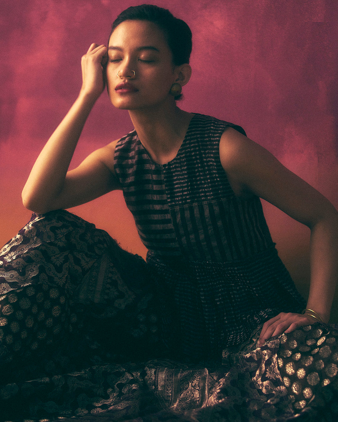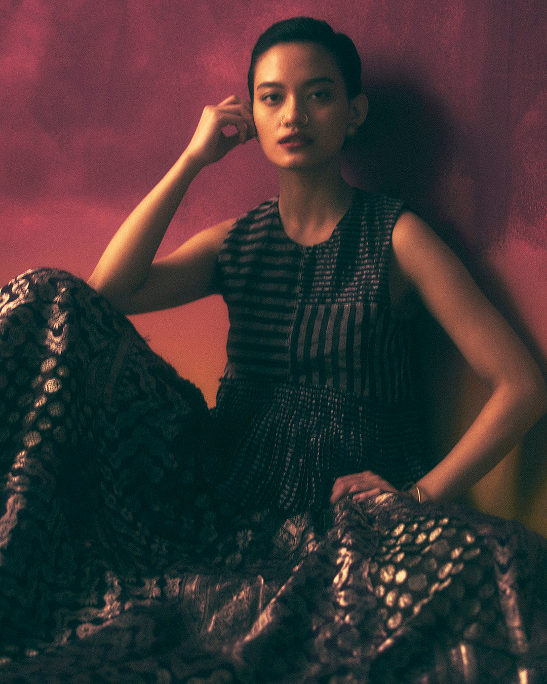 hand micro-pleated peplum top, upcycled using striped tissue zari silk with kantha stitches holding the pleats