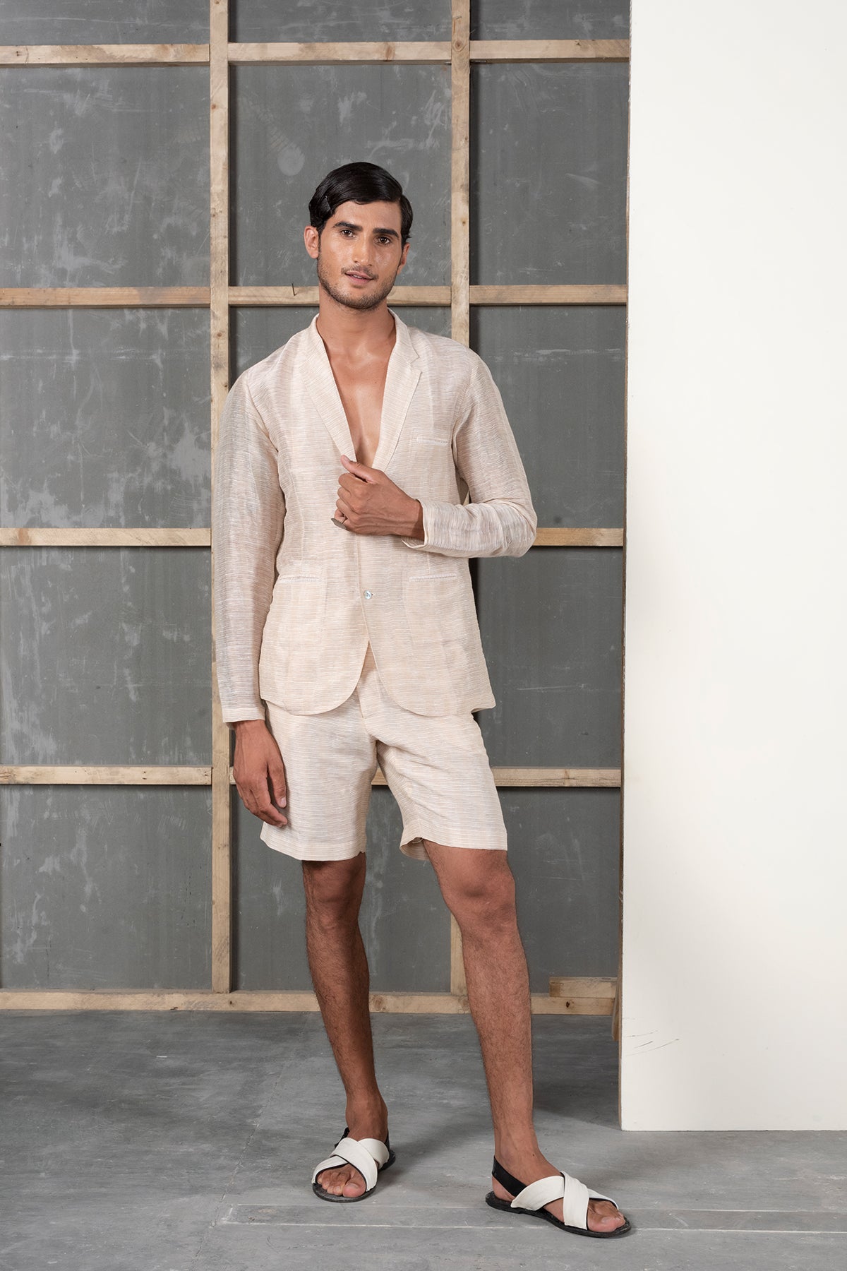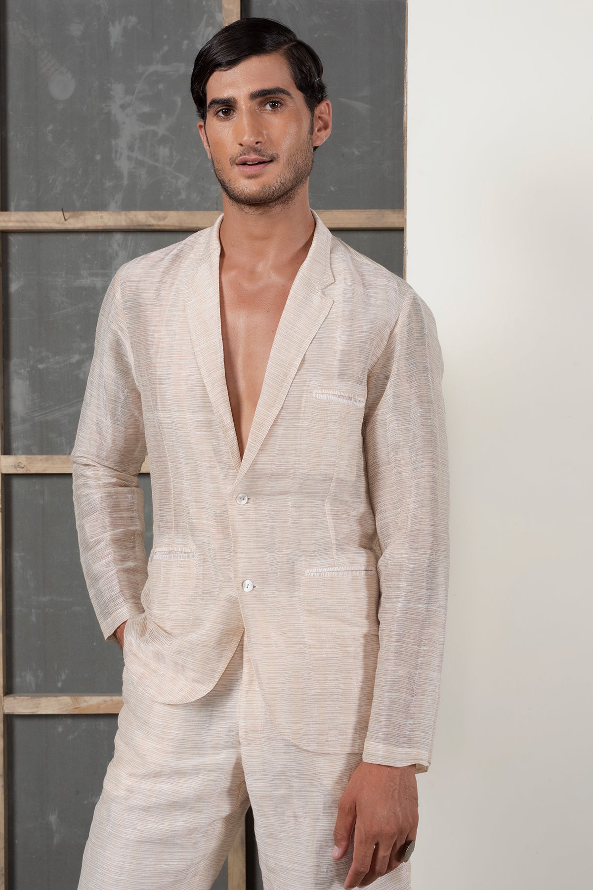 Tailored blazer in handwoven silk linen with metallic yarns