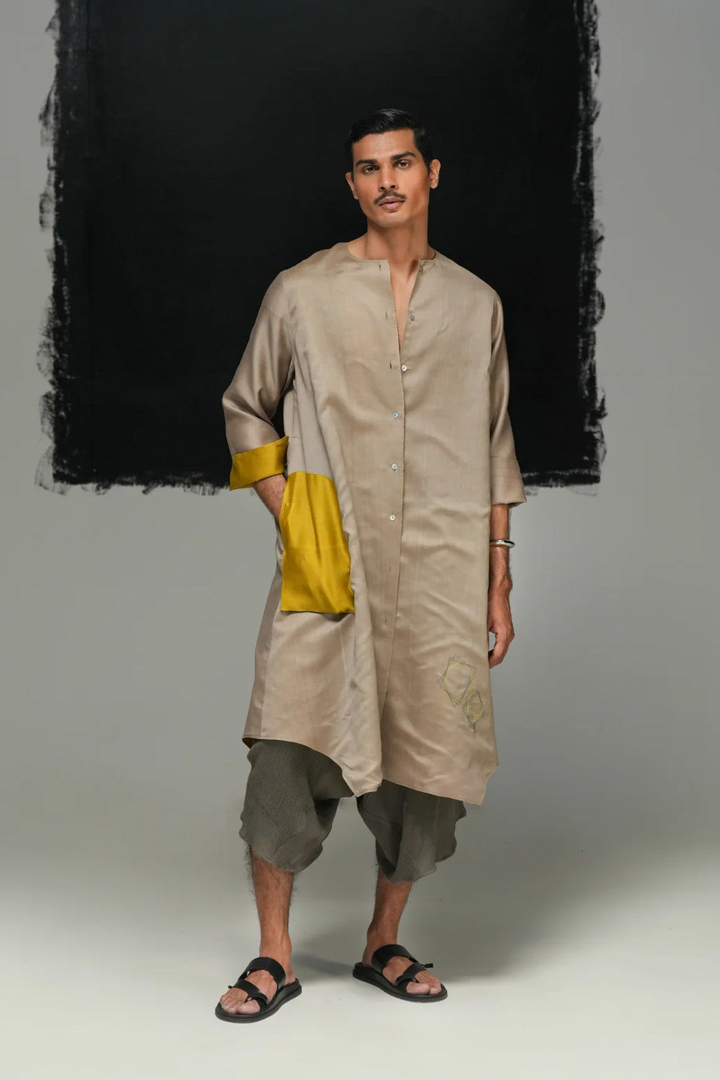 The mei dress is crafted in handwoven mulberry silk and adorned with all-over hand-done kantha work, meticulously stitched by in-house women artisans. designed for versatility, it is fully reversible, offering two distinct looks—one side in a vibrant dusty pink and the other in a subtle warm grey. a timeless piece that blends heritage craftsmanship with modern adaptability.