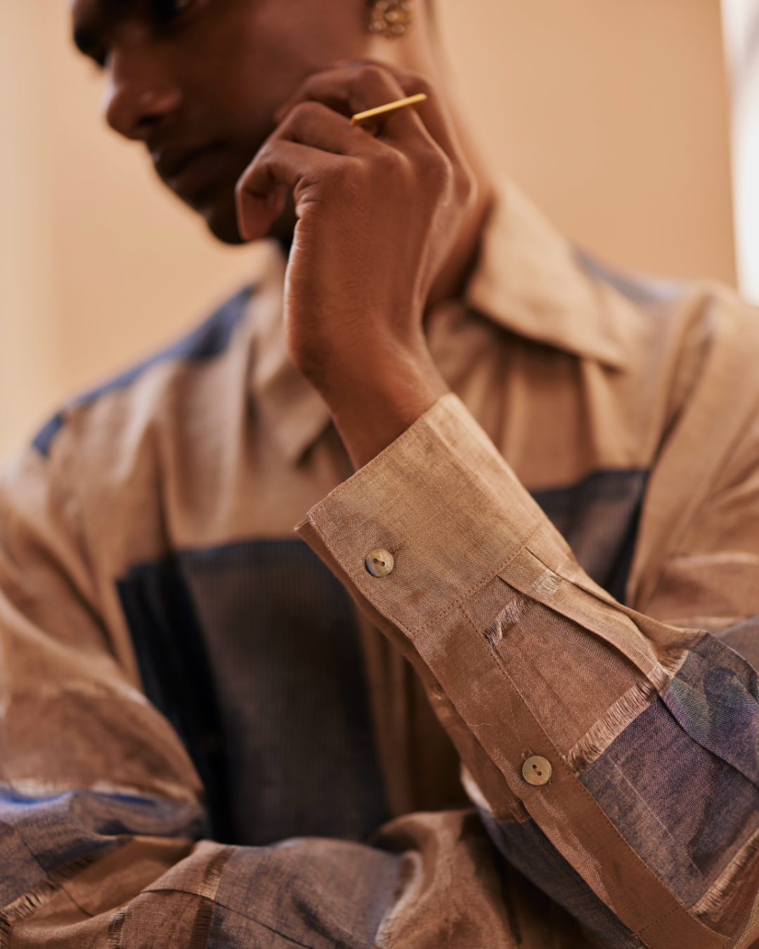 Button-down tunic with exaggerated pockets, interesting inner panel and tie ups in handwoven tissue silk. Pair with our crescent pants for a festive look.