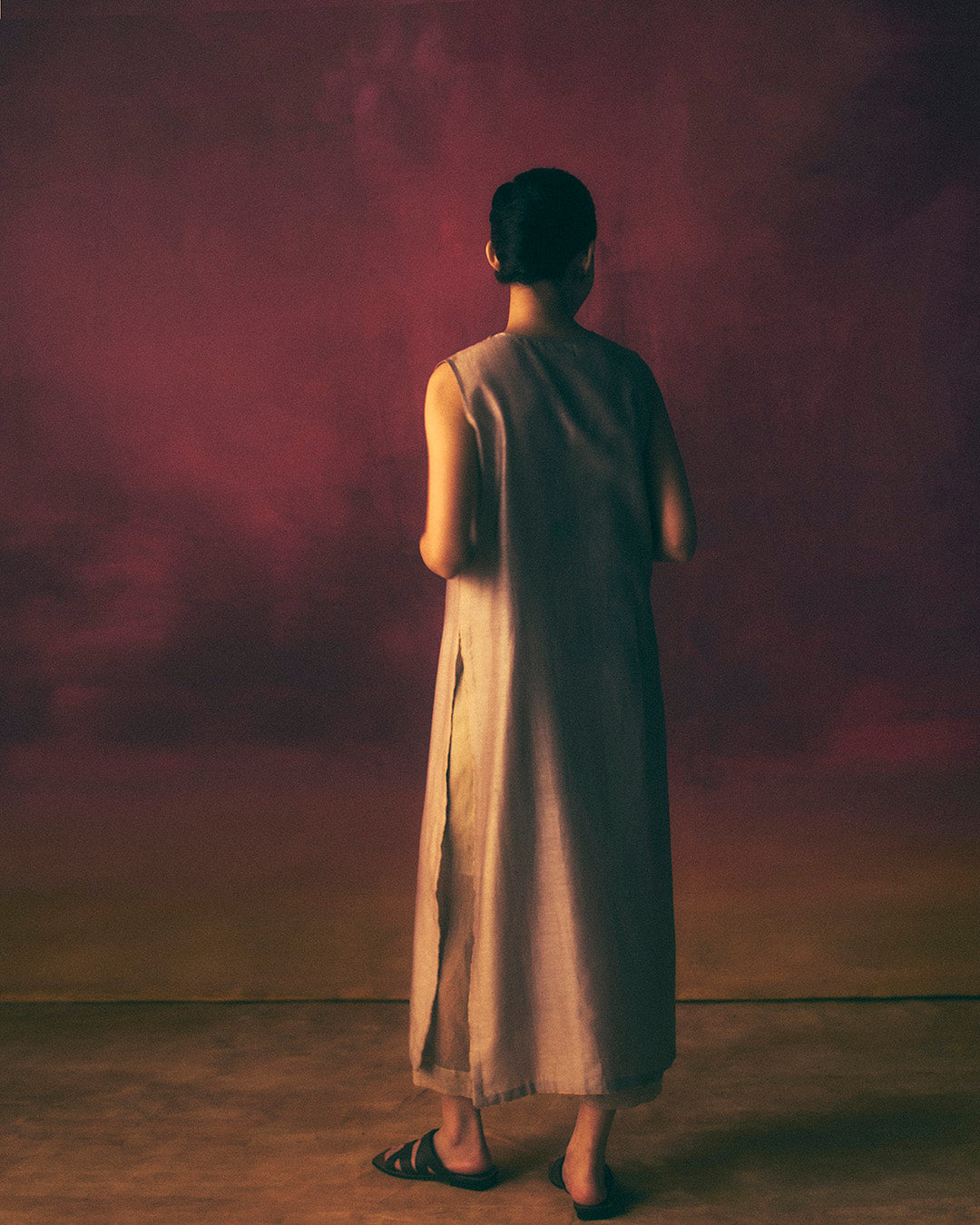 Hand blockprinted slim line long tunic in chanderi silk with zari stitch line details