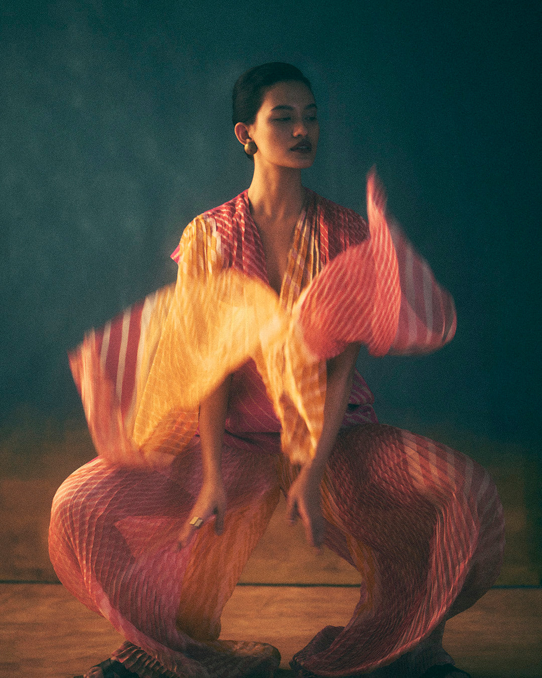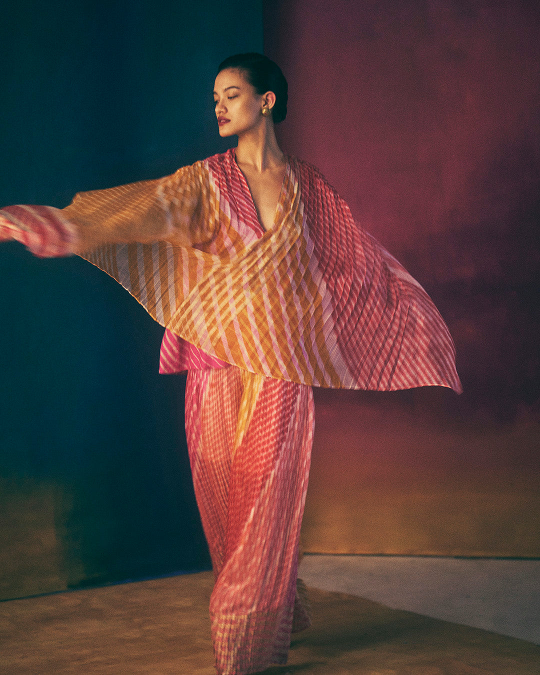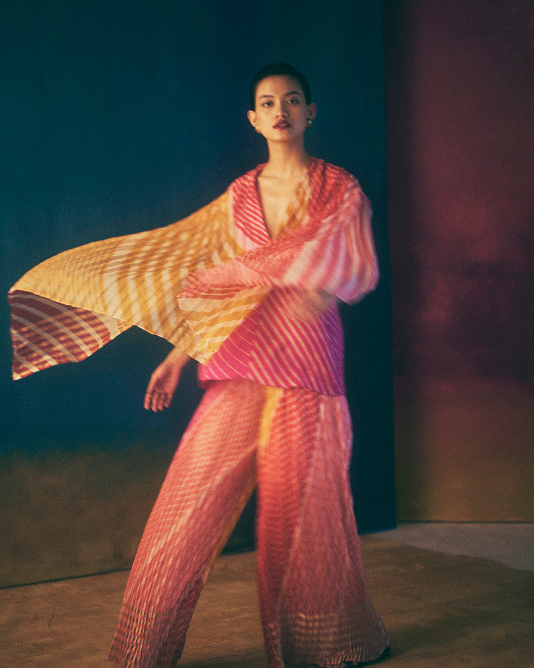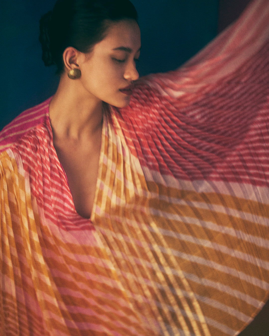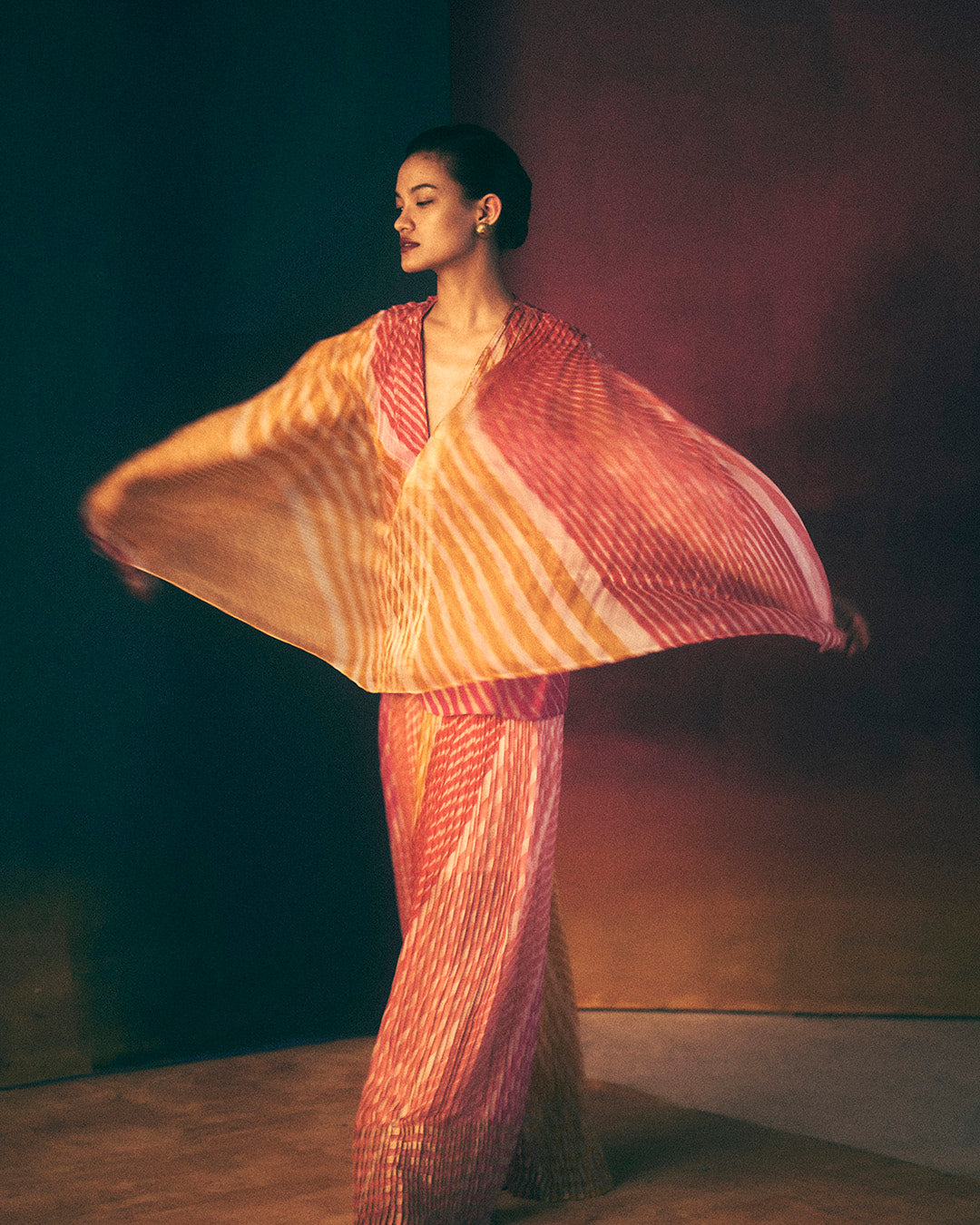 Layered hand tie dyed leheriya and micropleated top with kantha stiches in zari silk kota doria and linen