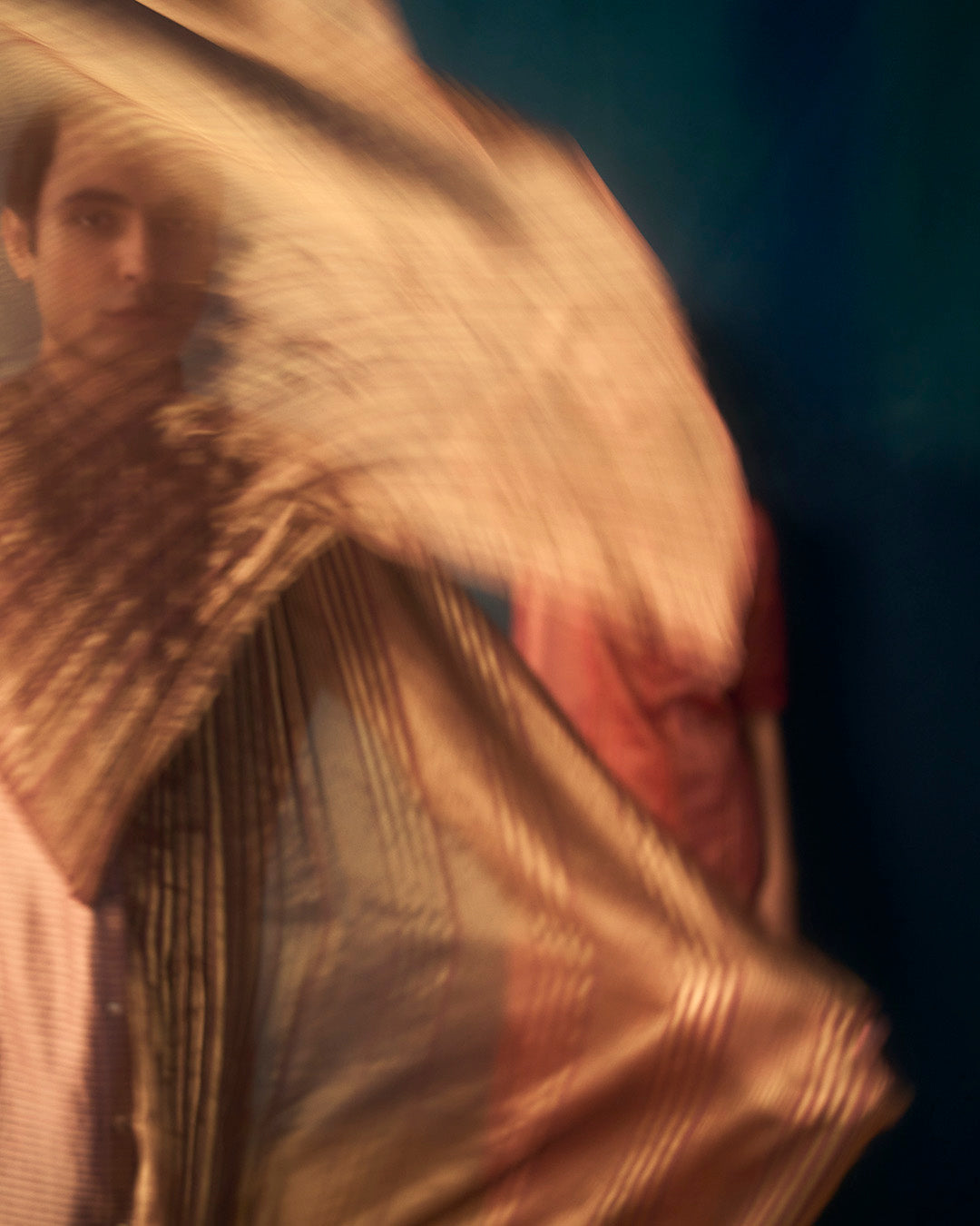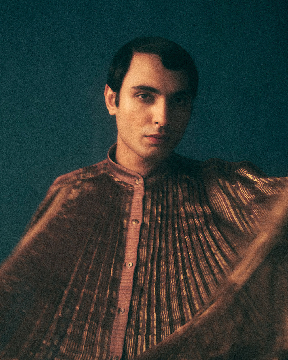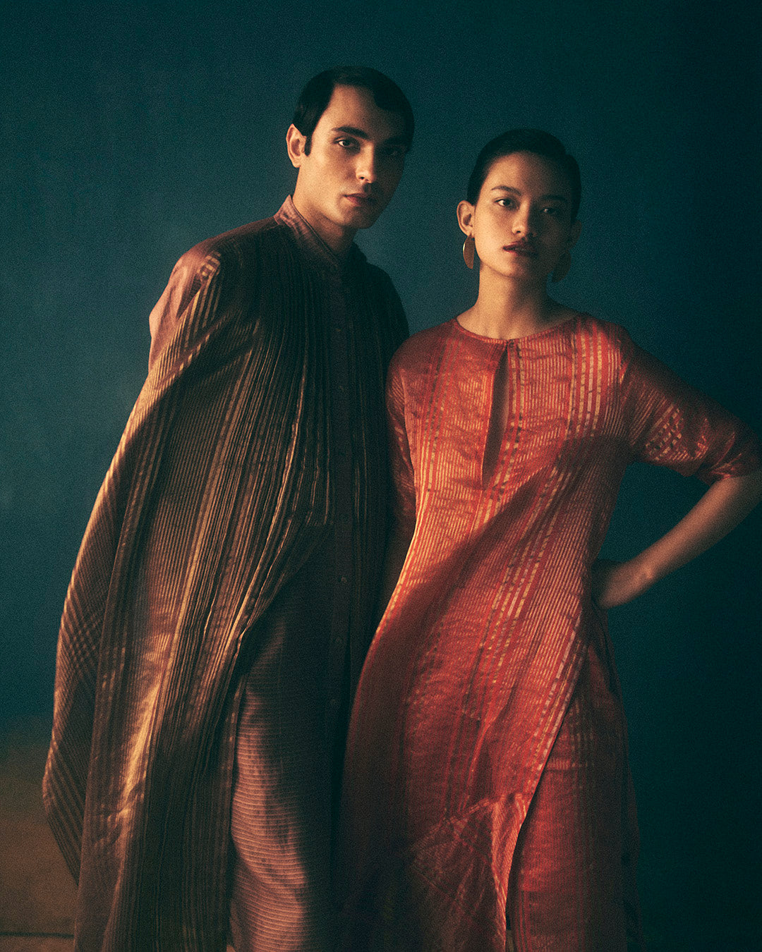 Easy-fit kurta in striped tissue and chanderi silk with knife pleated fabric attached to the shoulder.