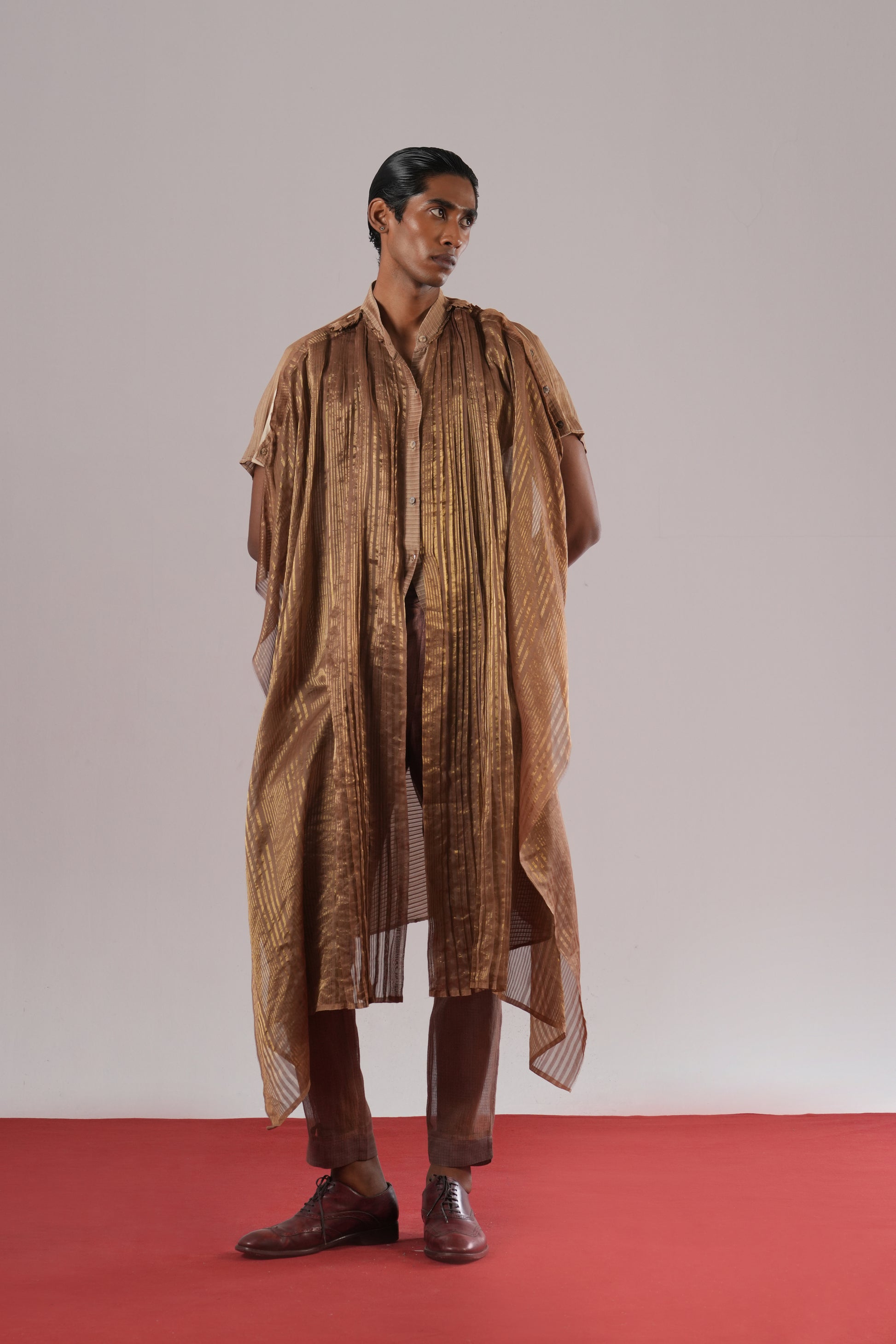 An easy-fit kurta in striped tissue and Chanderi silk, featuring knife-pleated fabric attached at the shoulder.