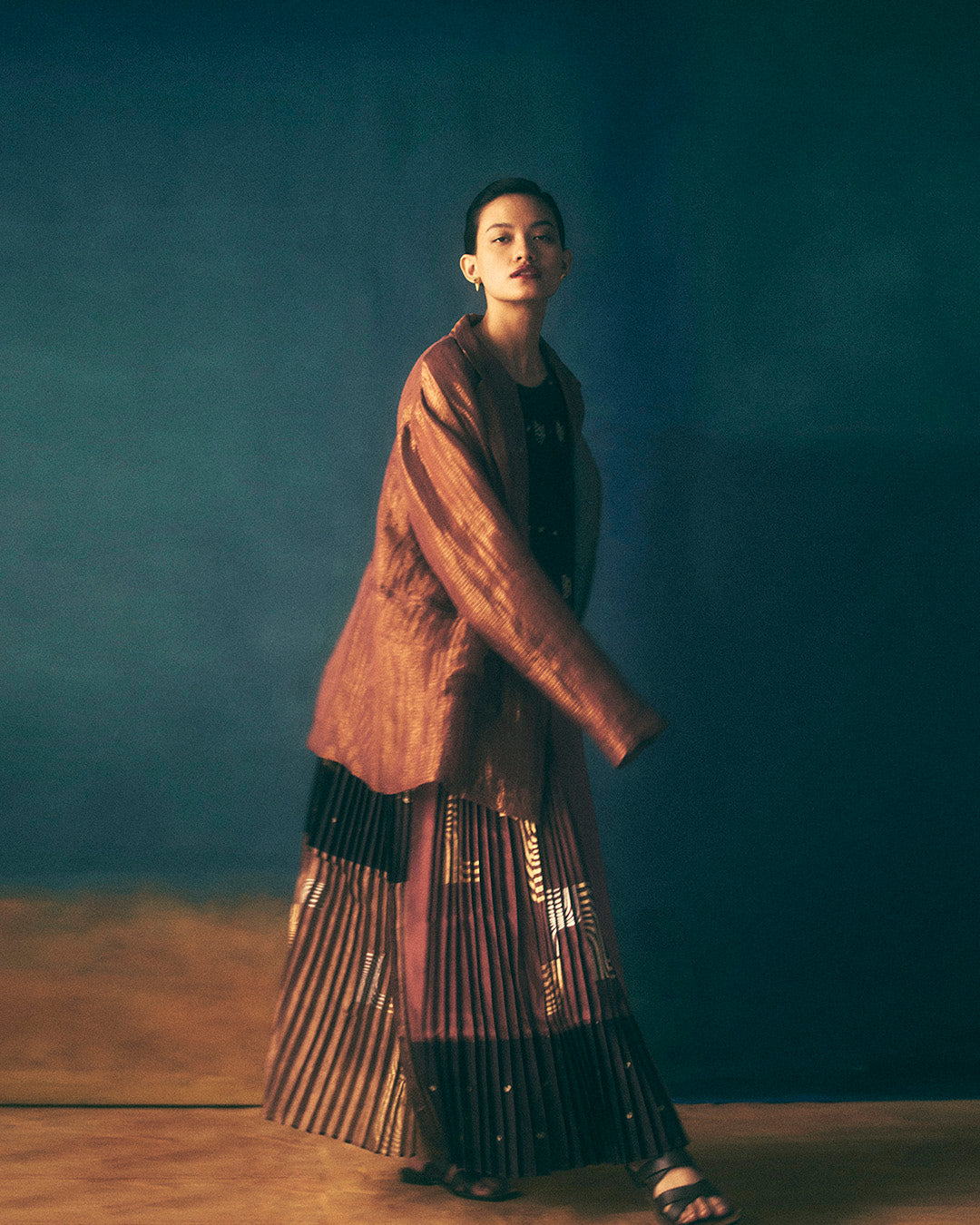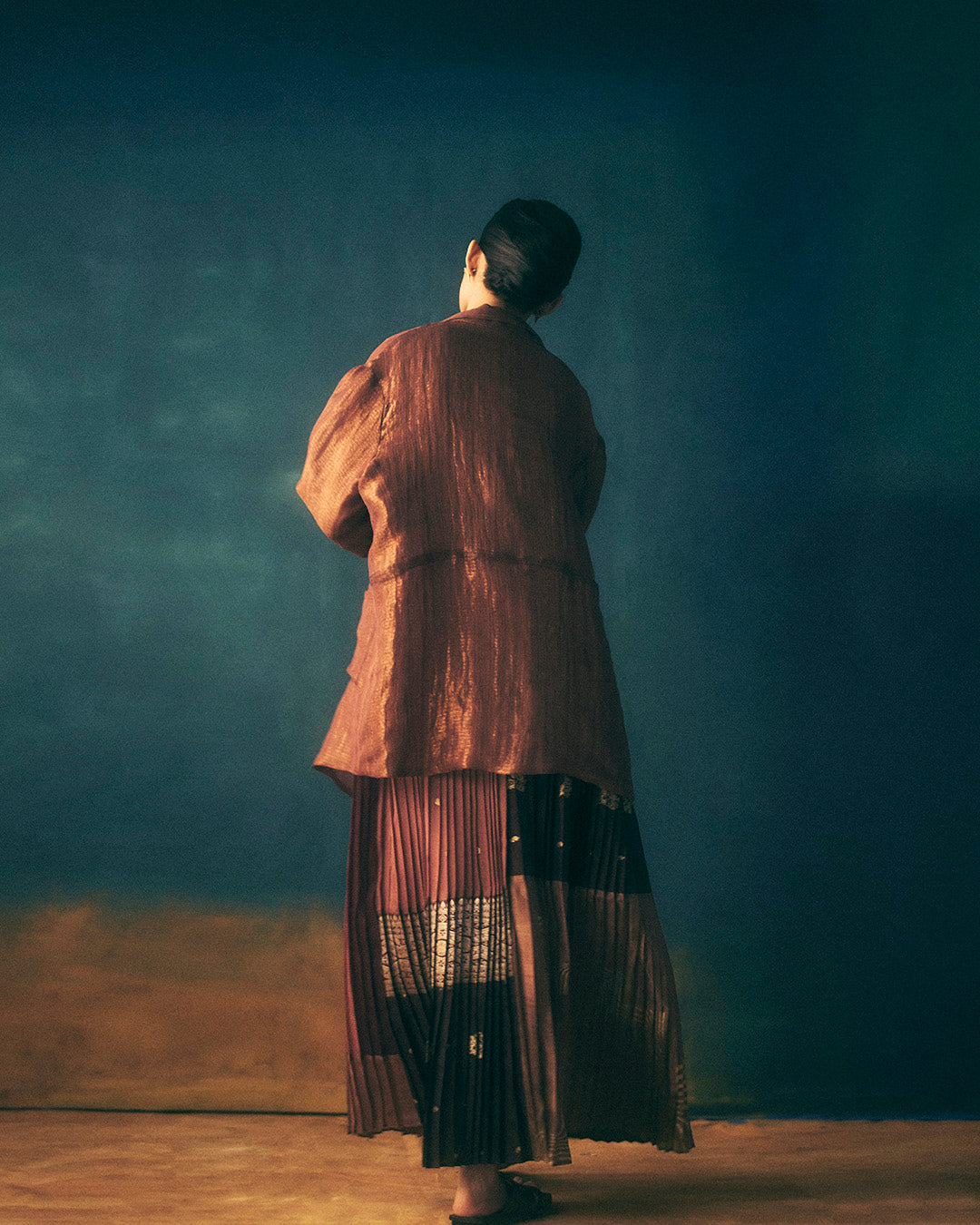 Tailored blazer in sheer zari kota silk with jali work and stitch line details