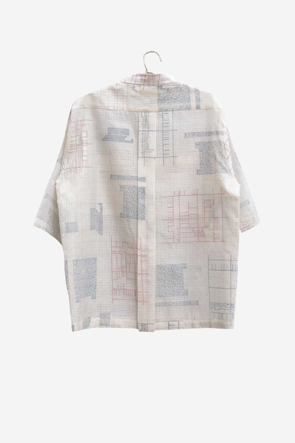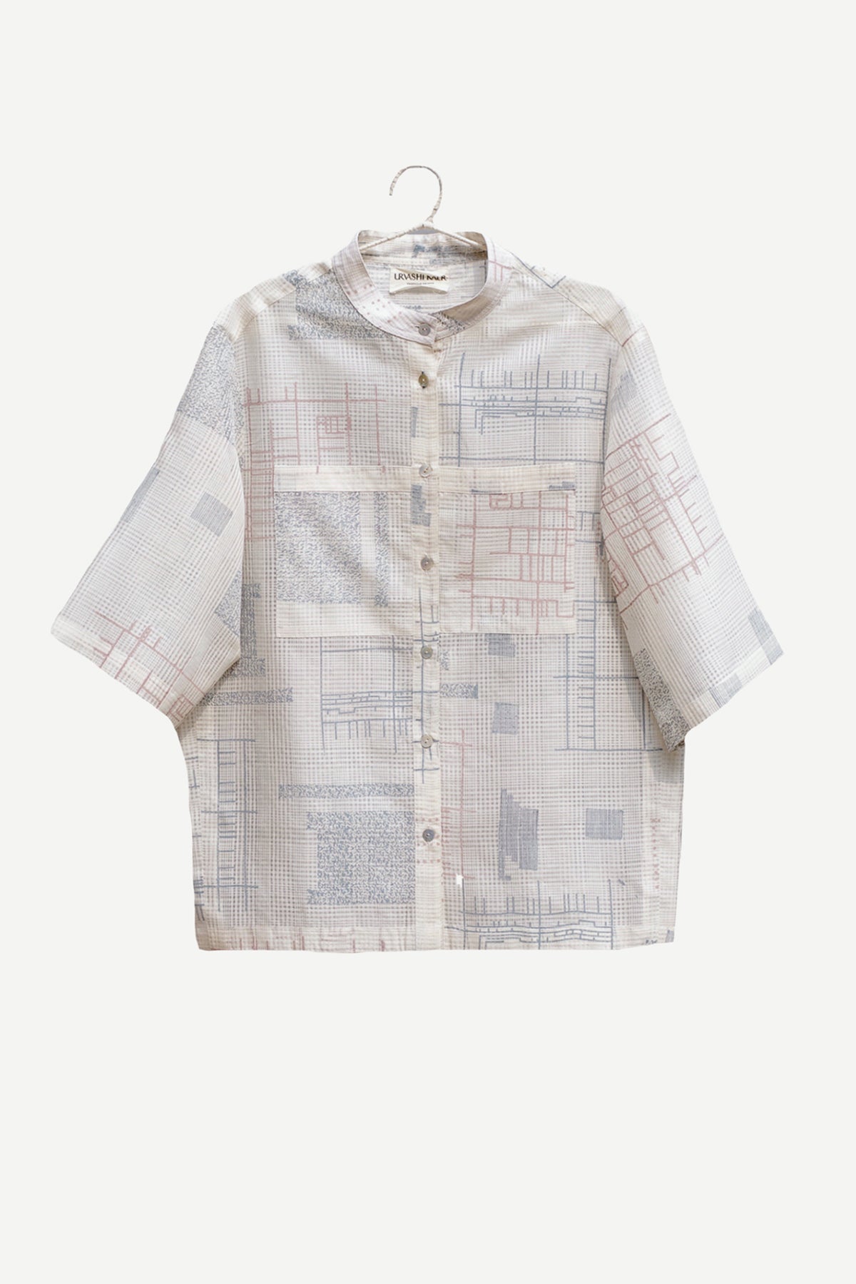 Blockprinted boxy cropped shirt in checkered maheshwari silk, handwoven by the artisans of maheshwar