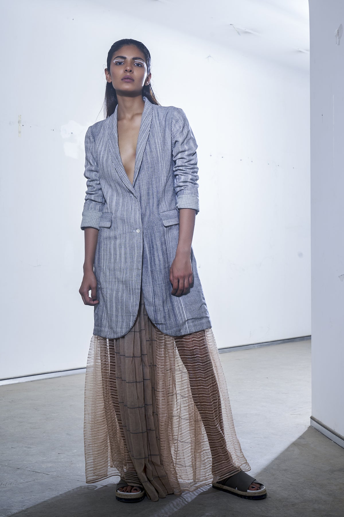 Micro-pleated midi skirt in sheer panels of kota doria silk and linen noil