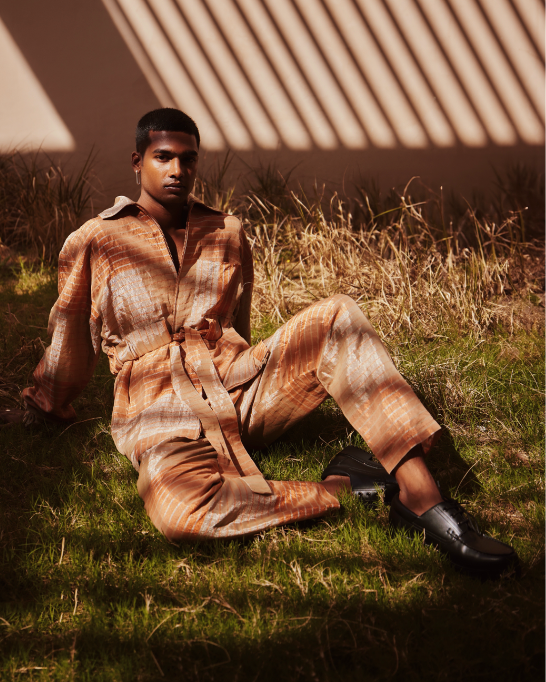 An oversized double zipped bomber jacket in handwoven tissue silk. Pair it with our Iwa pants for a contemporary look.