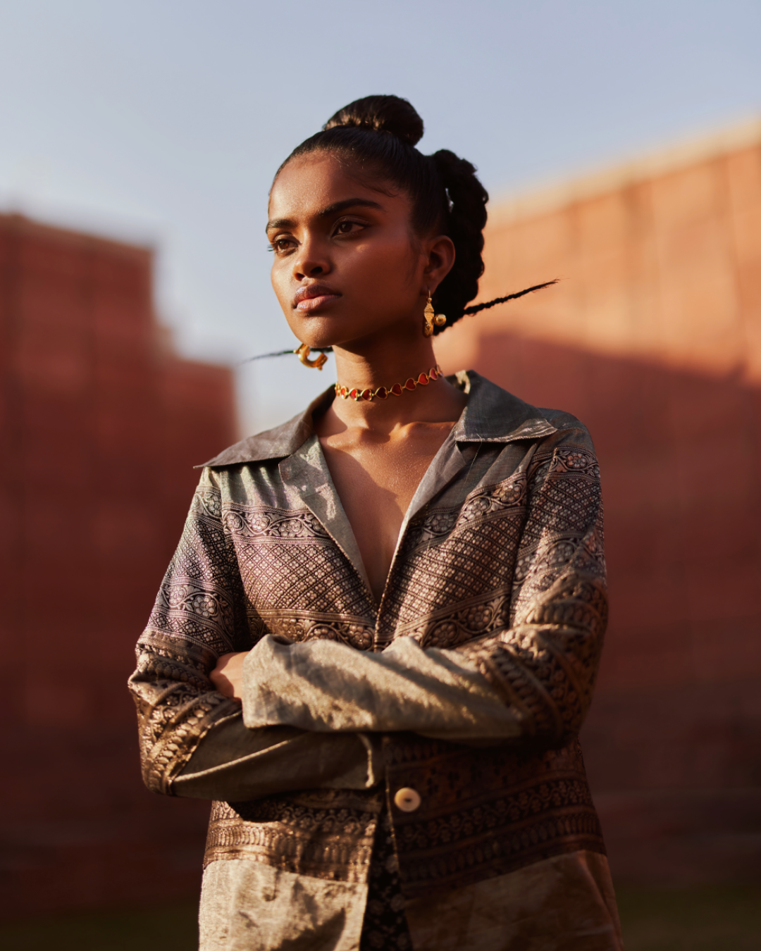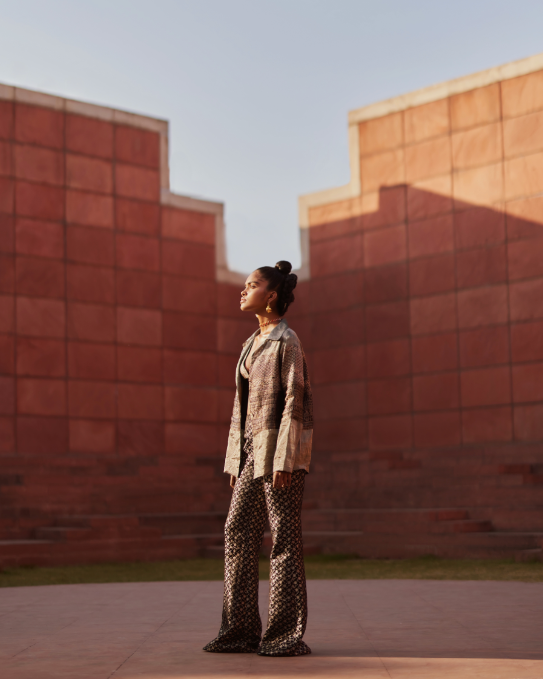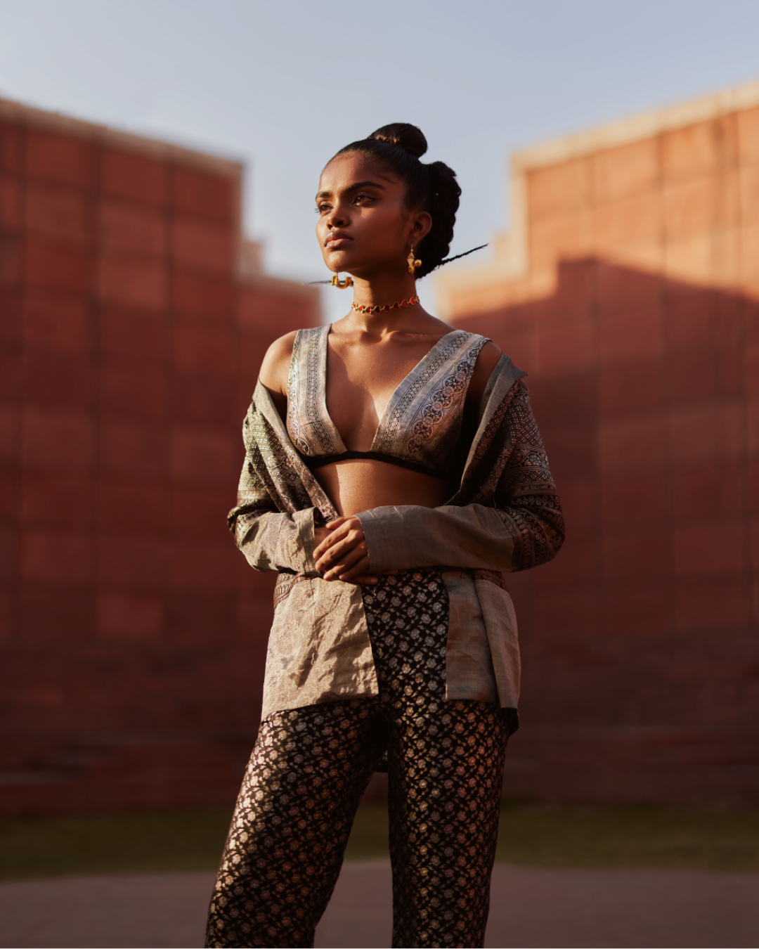 A stylish contemporary collared jacket meticulously crafted in vintage brocade silks and handwoven tissue silk .
