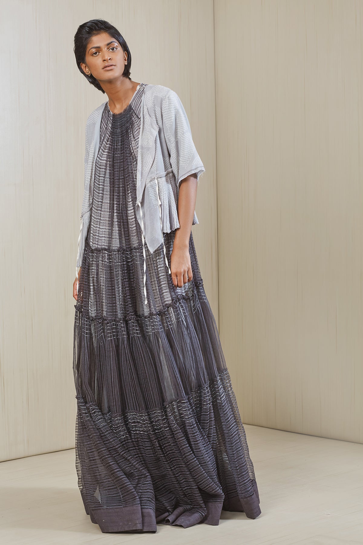 Flowy, tiered tent dress in linen noil with kantha stitches holding the pleats and stitch line details on the hemline adding texture