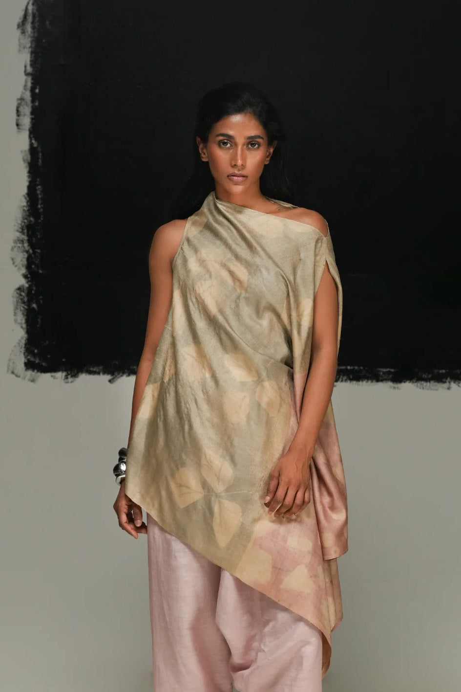 Ombrè dyed A-symmetric sleeveless top in natural red hue crafted with handwoven tussar silk with faux cinch detail at the waist.