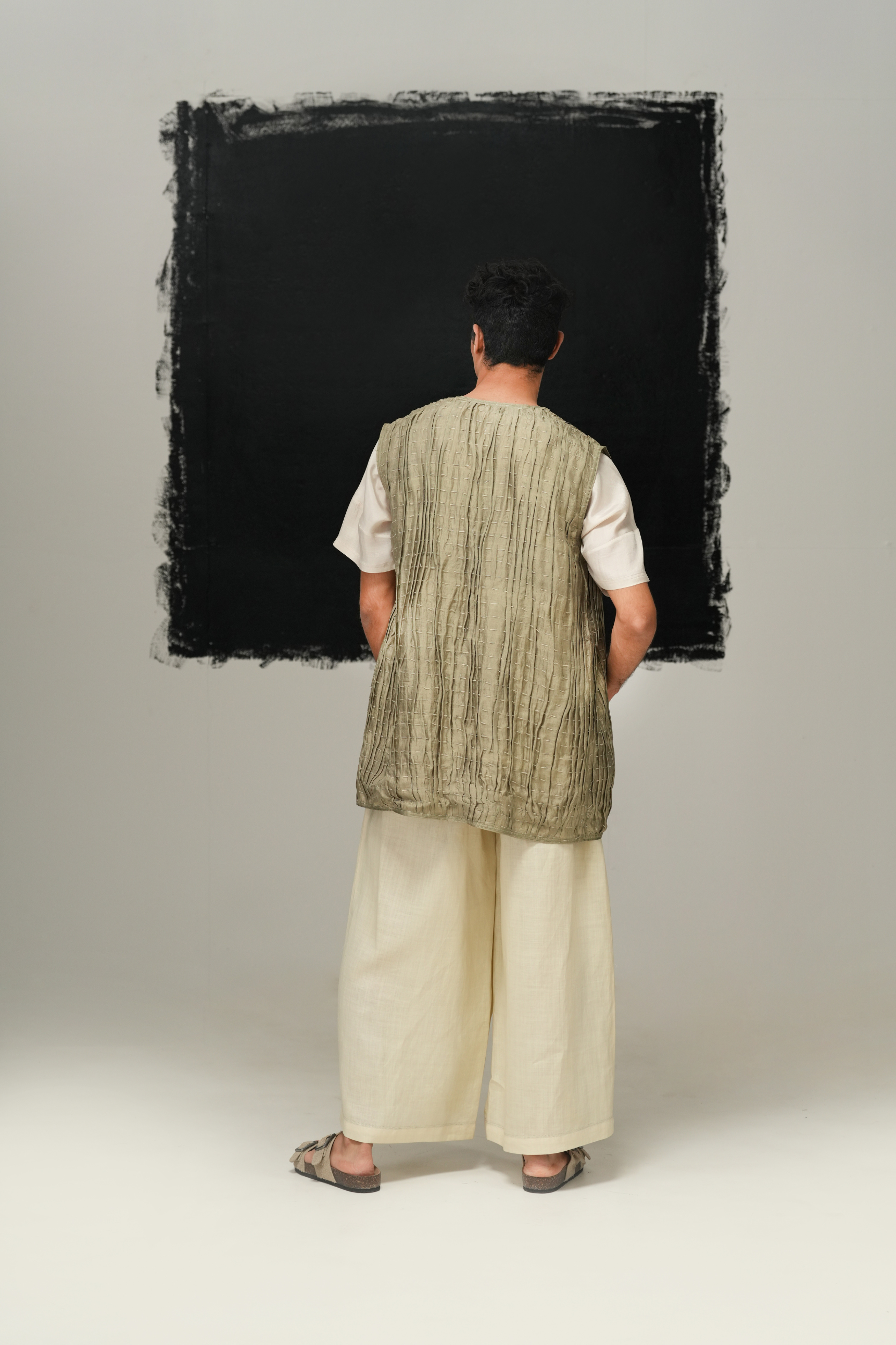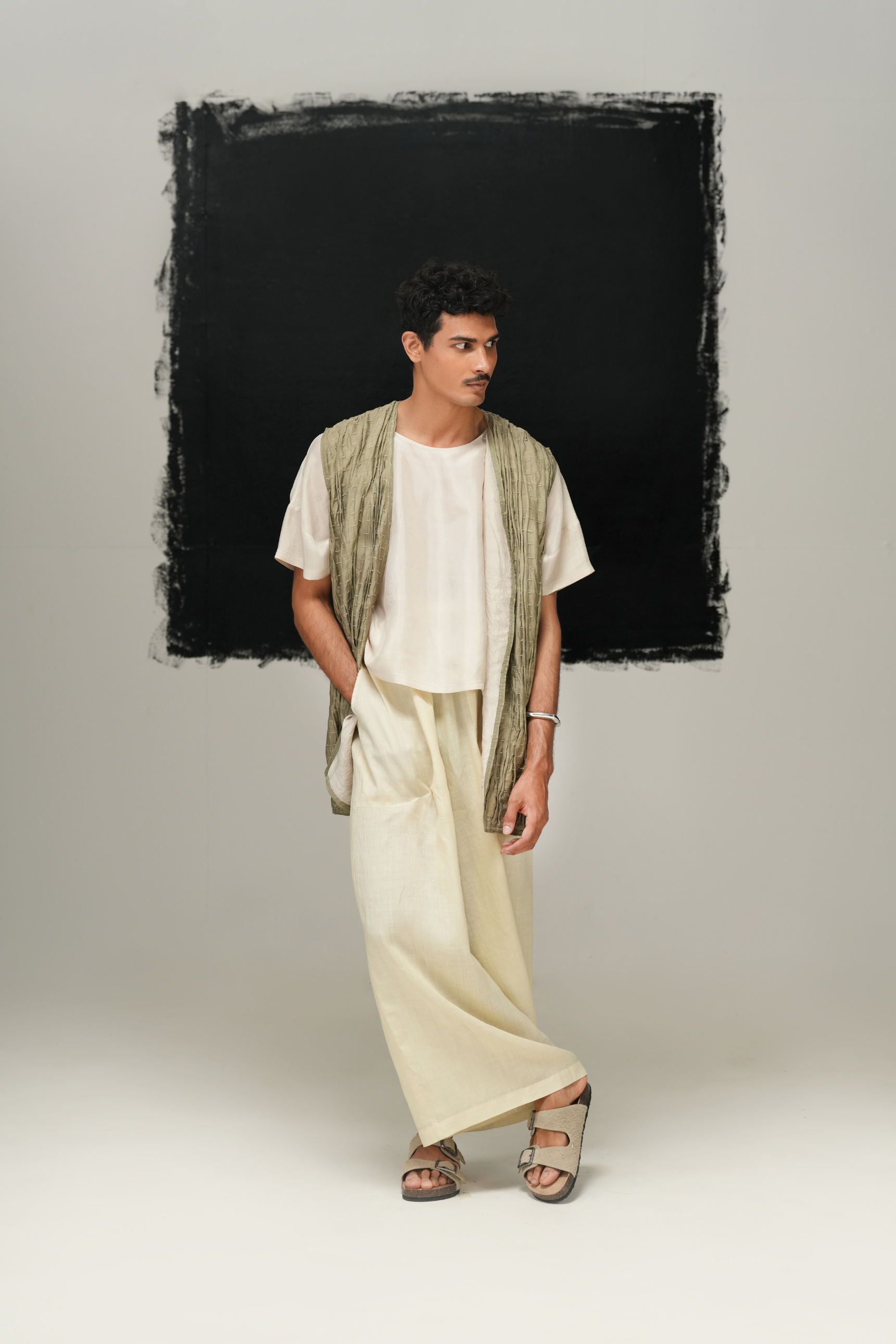 A waistcoat that's crafted in handwoven mulberry silk is a silhouette that captures the serenity of a peaceful wooden landscape and is elevated by the signature pleating techniques.