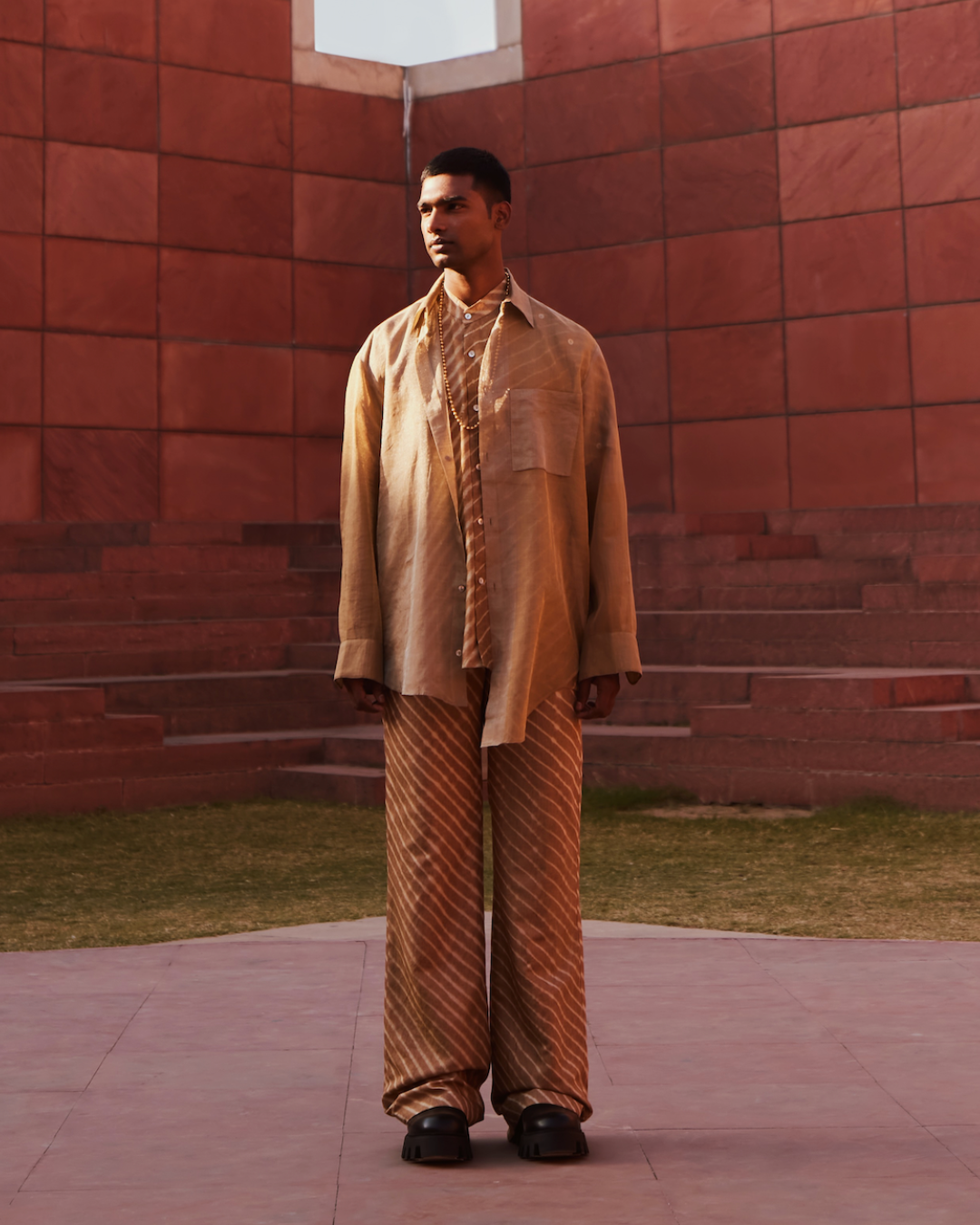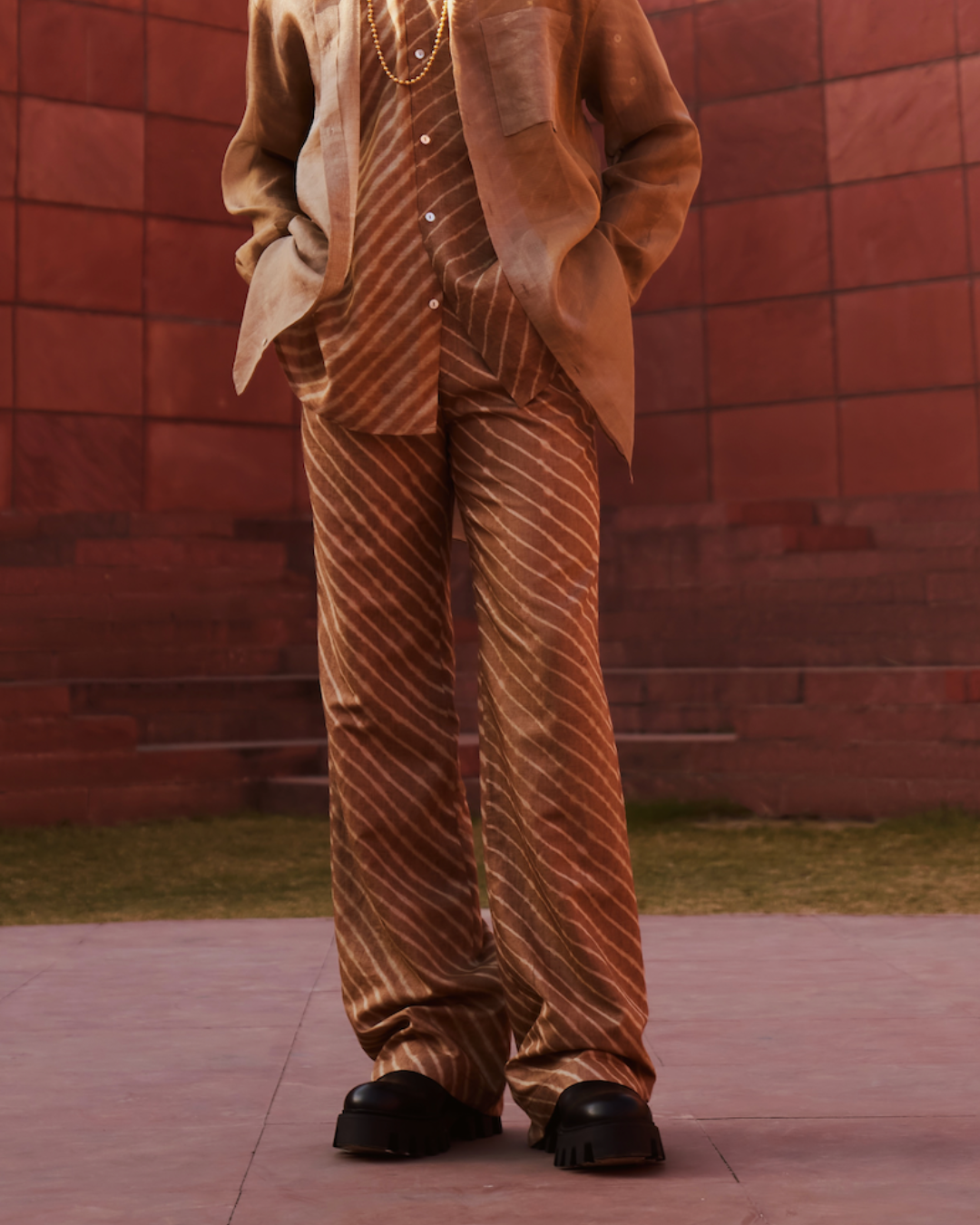 Tailored flared pants in zari tussar silk featuring hand dyed lehriya. Wear with a our co-ord cyprus shirt and an overlay.