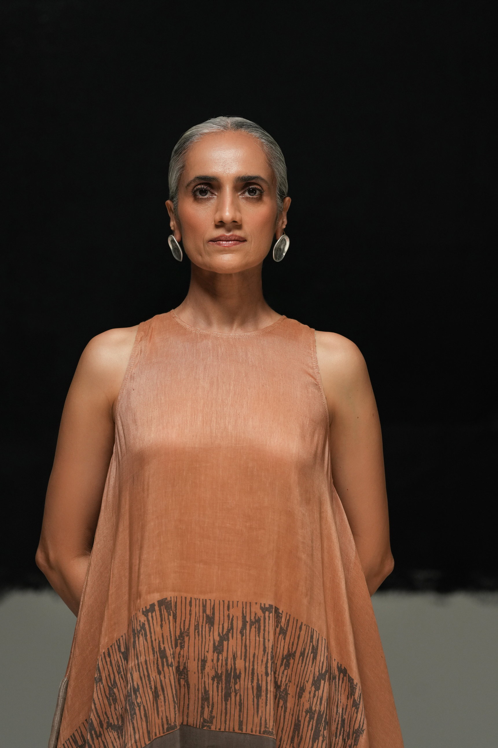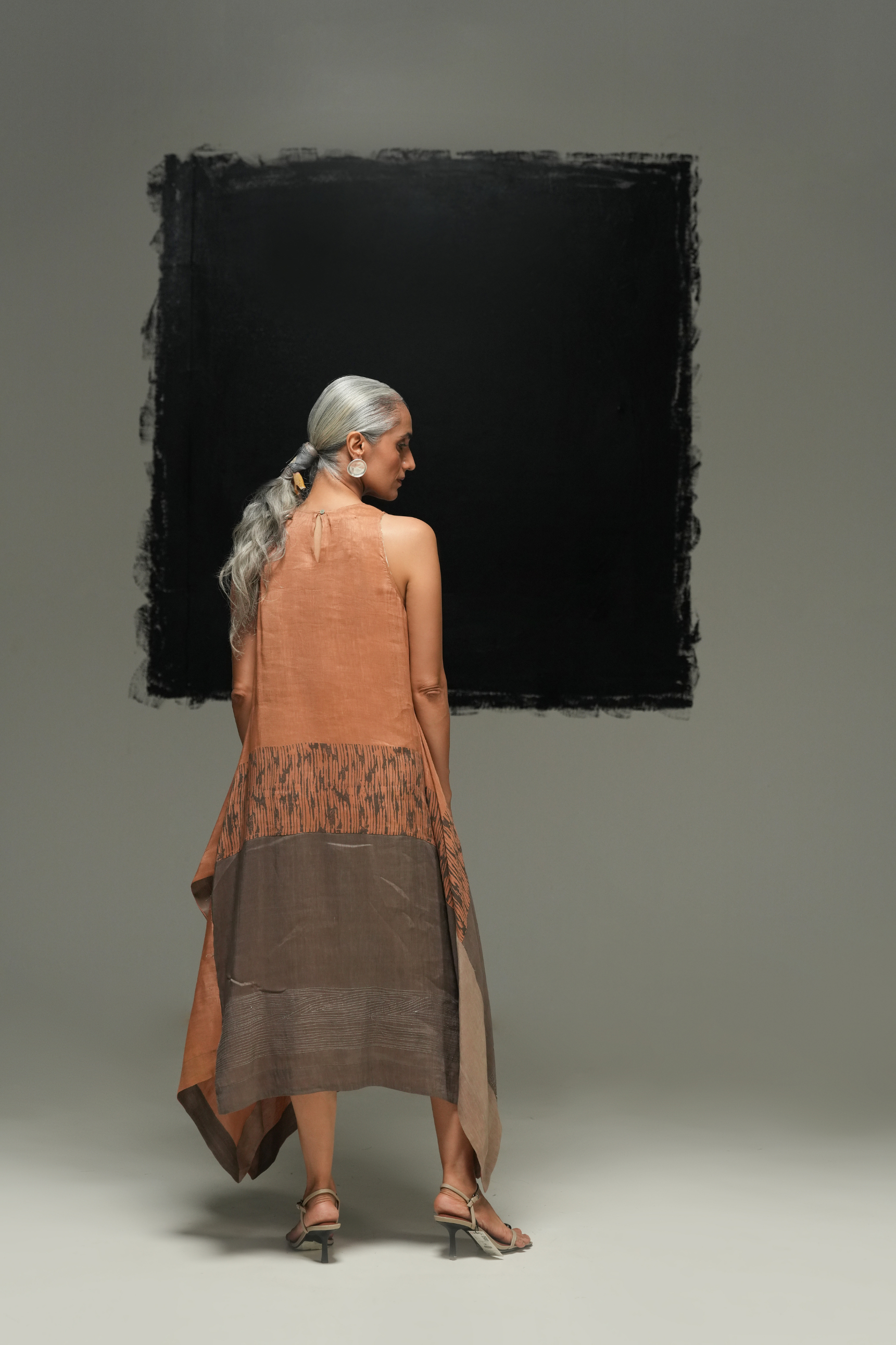 Relaxed fit dress in handwoven linen with intricate colour blocking design, adorned with intricate block printing.