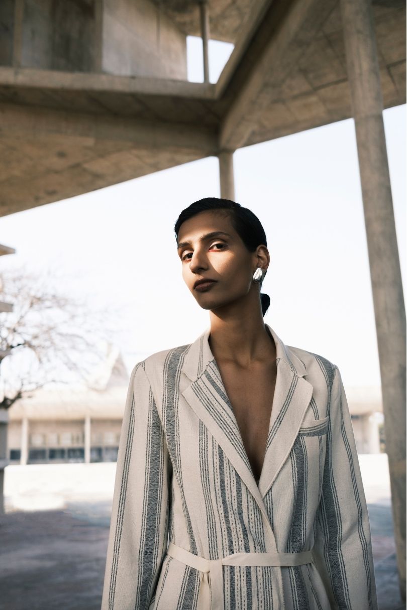 Tailored striped jacket with kantha details in 100% handloom cotton