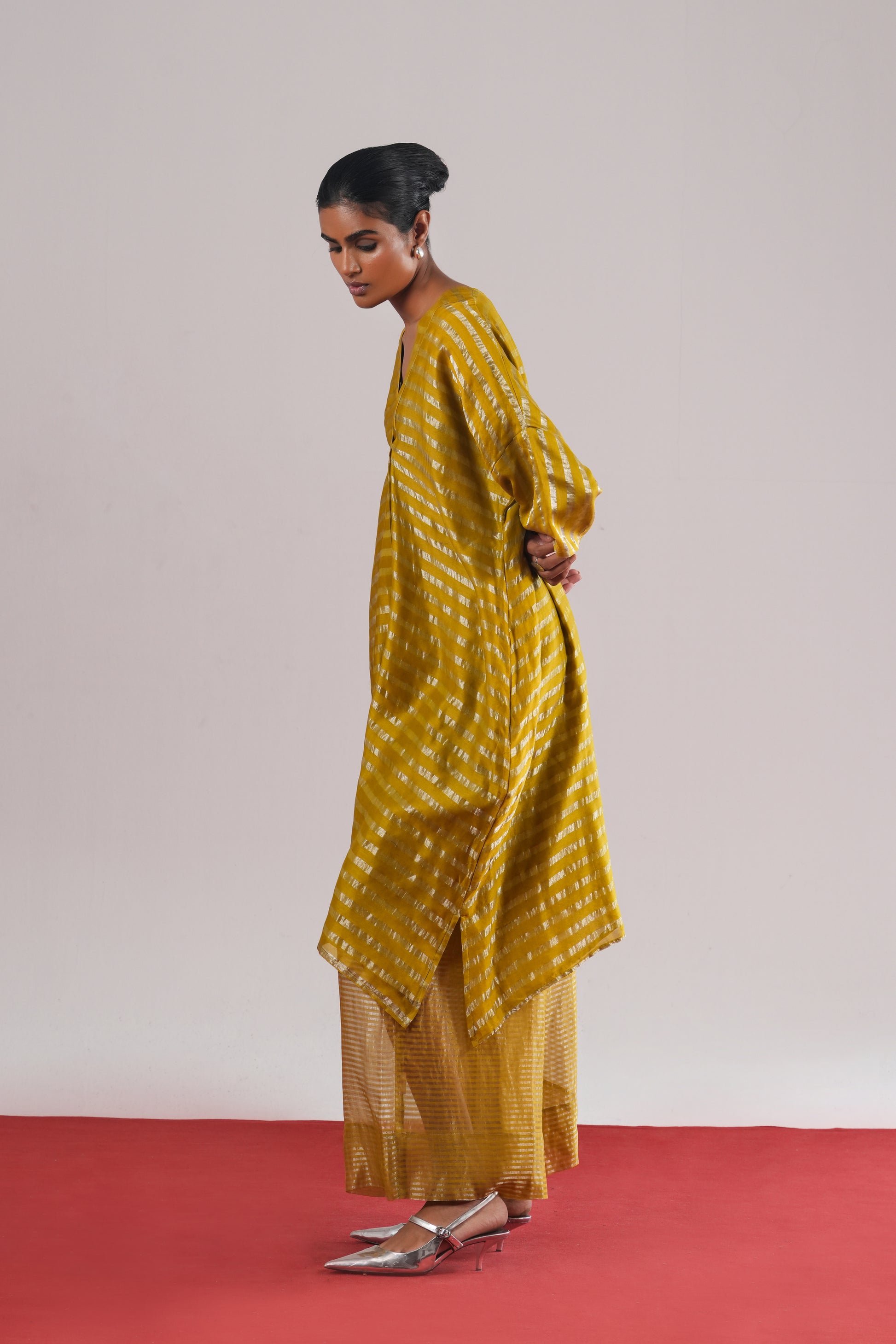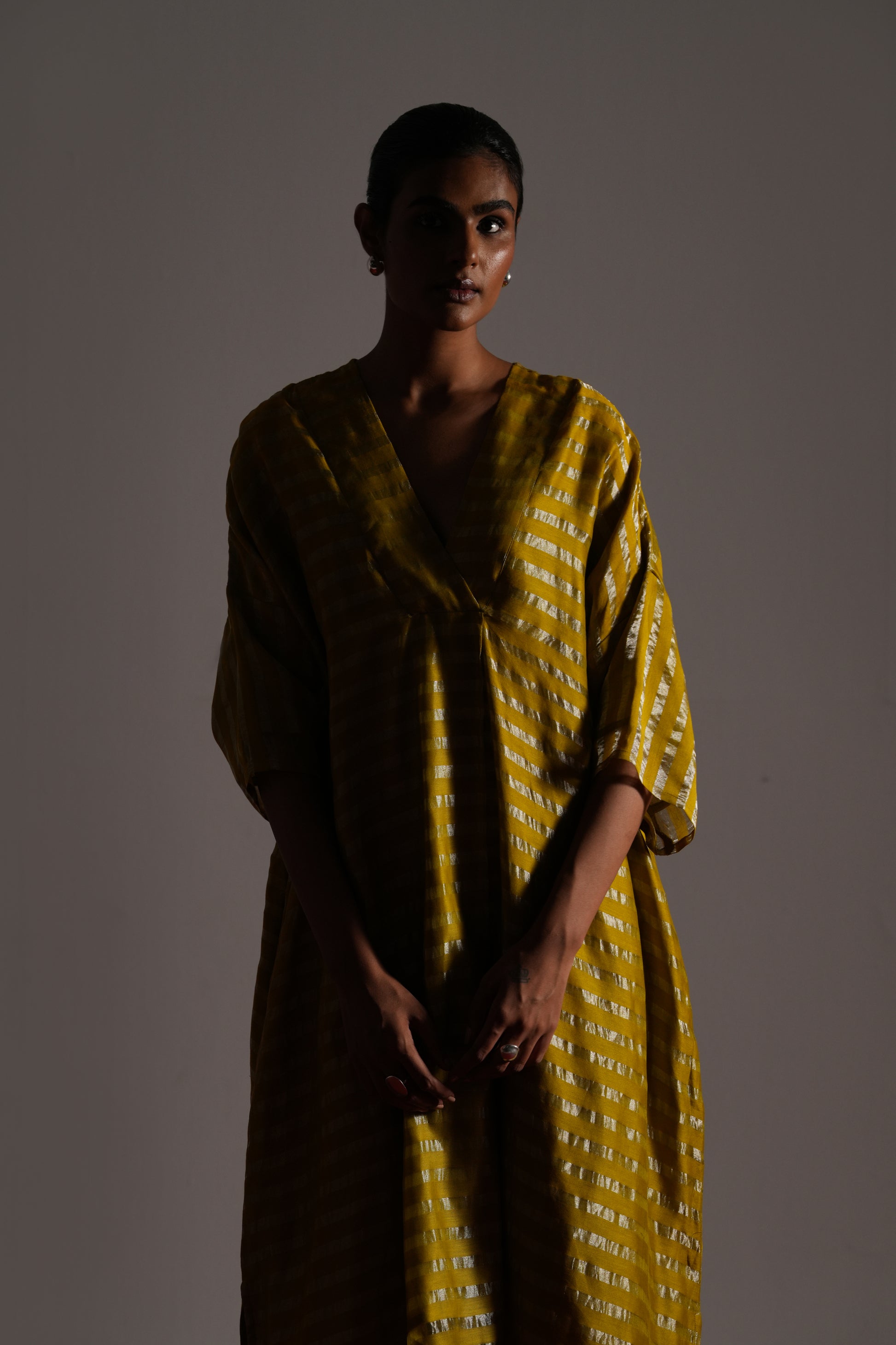 v neck , A- line dress in Zari tussar silk featuring hand dyed lehriya shibori and vintage brocade sleeves