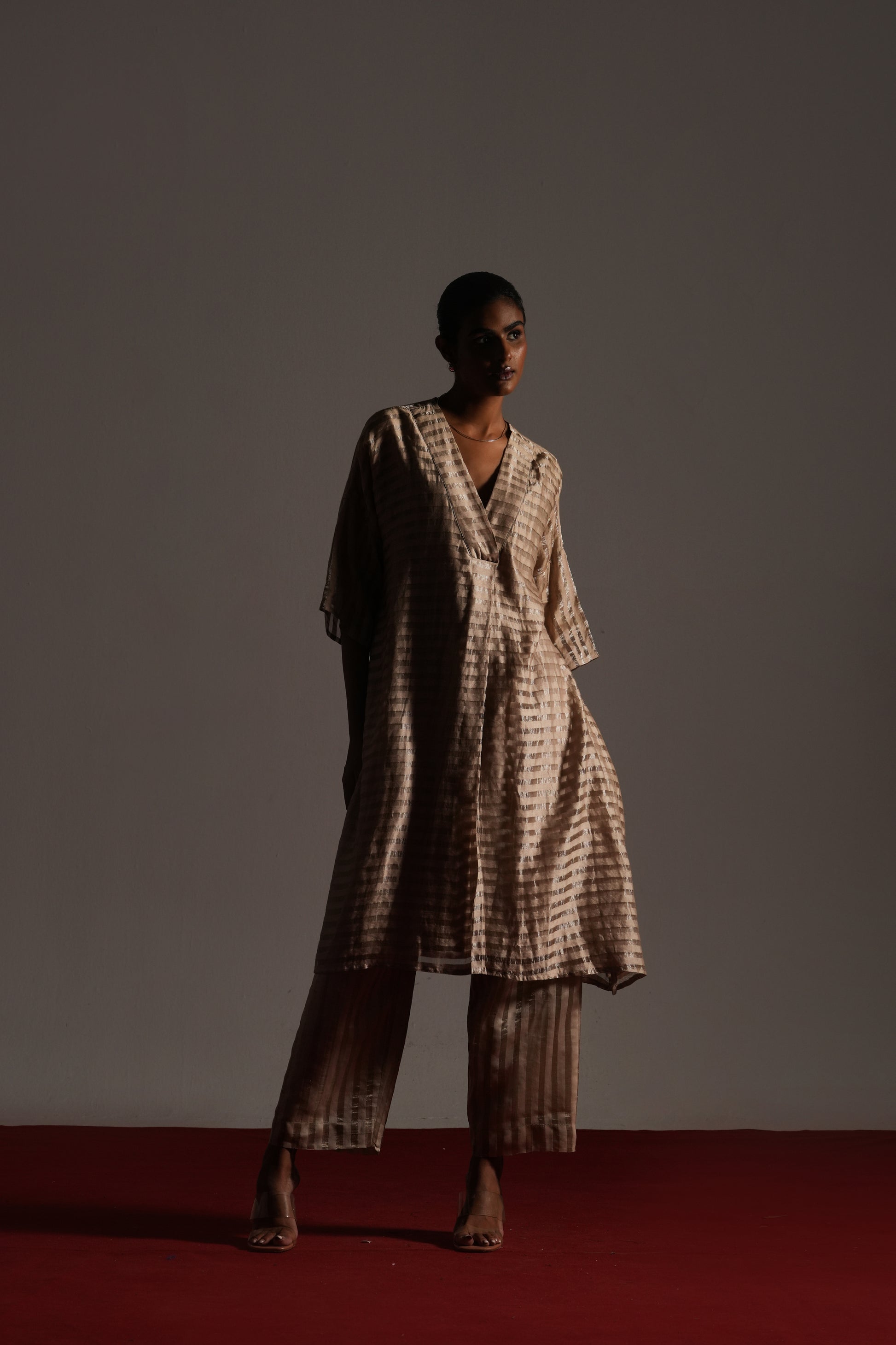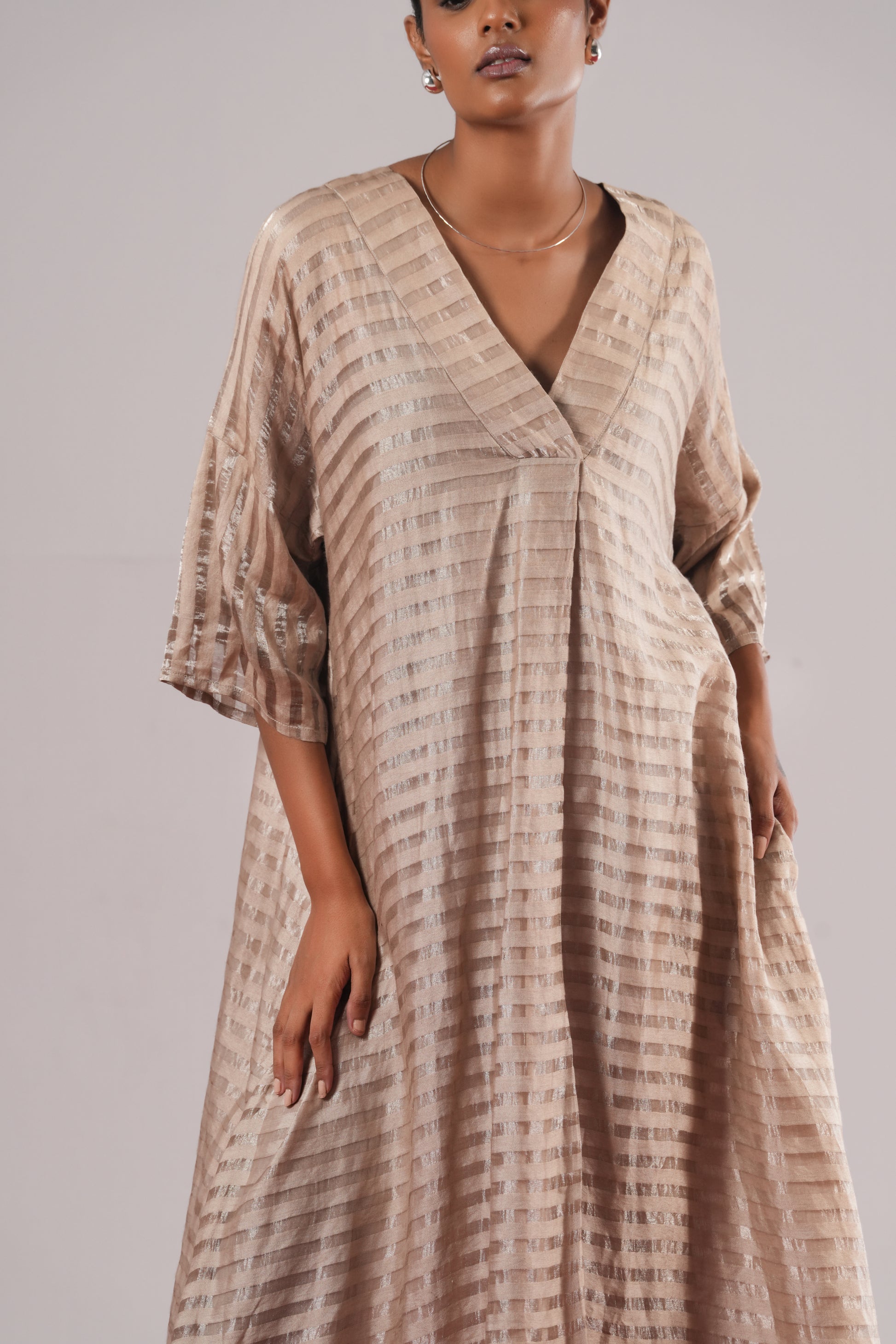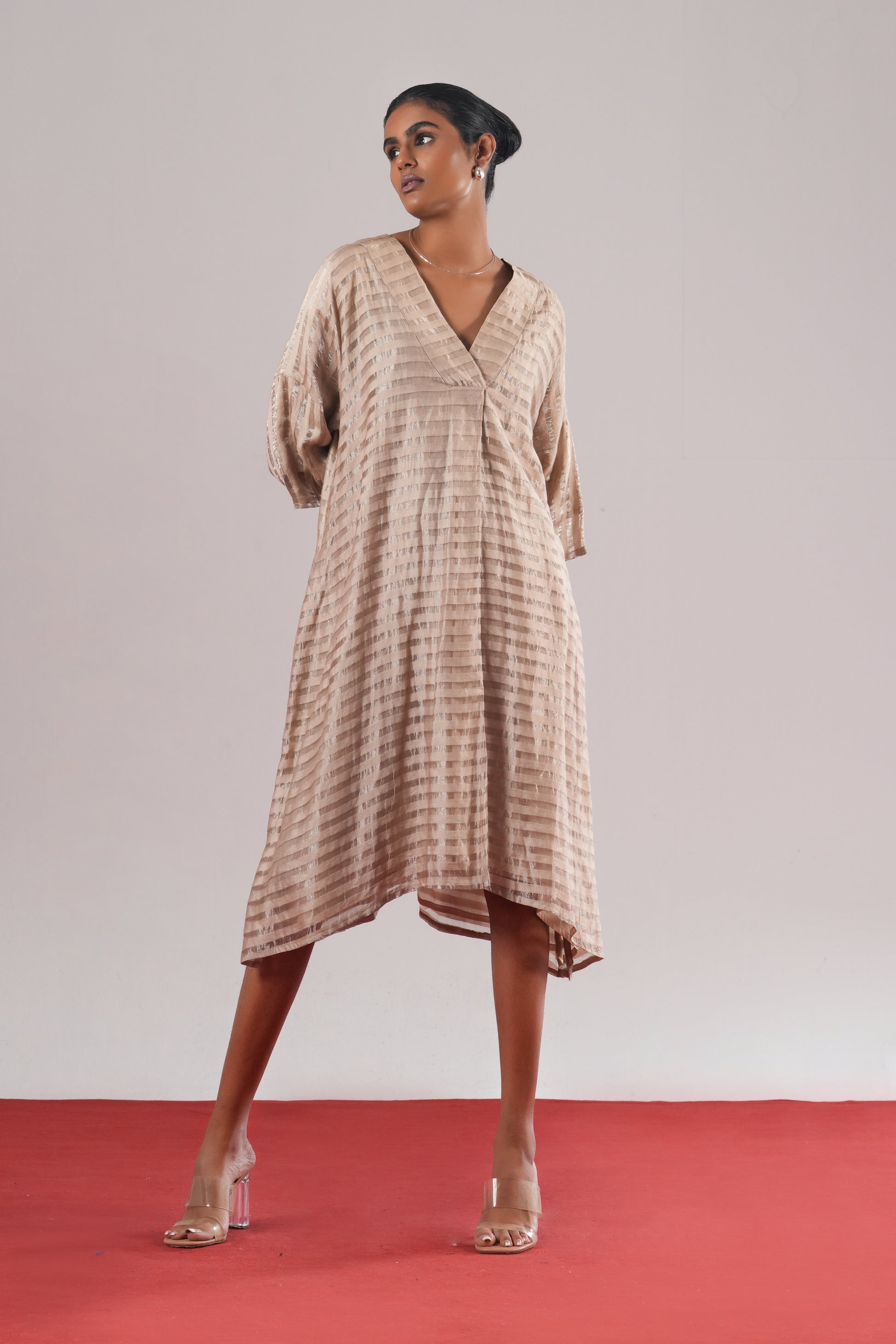 v neck , A- line dress in Zari tussar silk featuring hand dyed lehriya shibori and vintage brocade sleeves