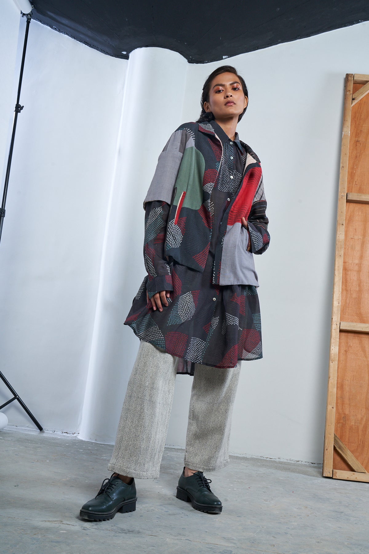 Oversized, easy shirt in shibori printed cotton silk wear three ways as a shirt dress, over lounge pants or unbuttoned over a dress