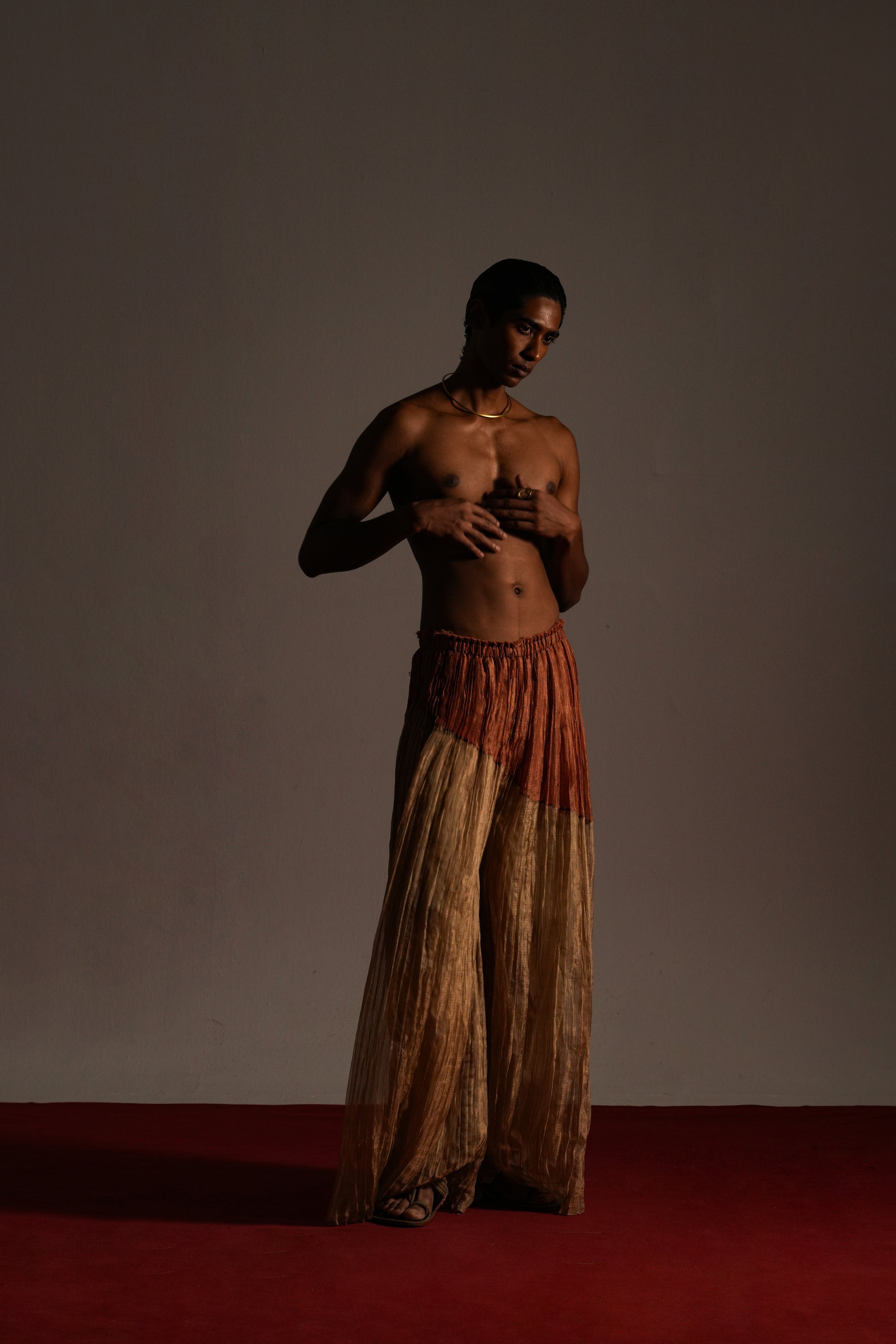 Colour-blocked pleated pants in handwoven zari Kota silk, designed to move fluidly between structure and ease. The Tangent Pants bring a contemporary edge to festive dressing through subtle play of texture and tone.