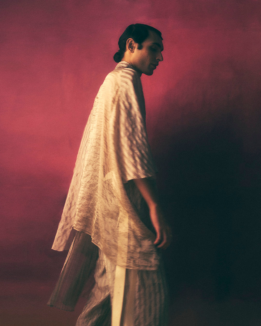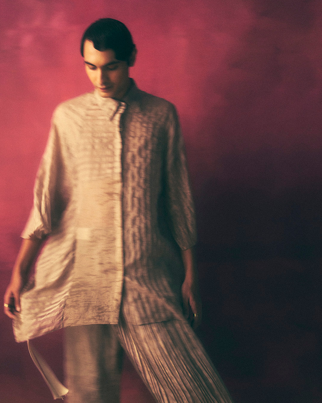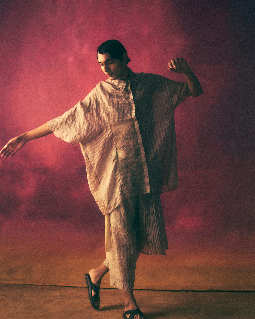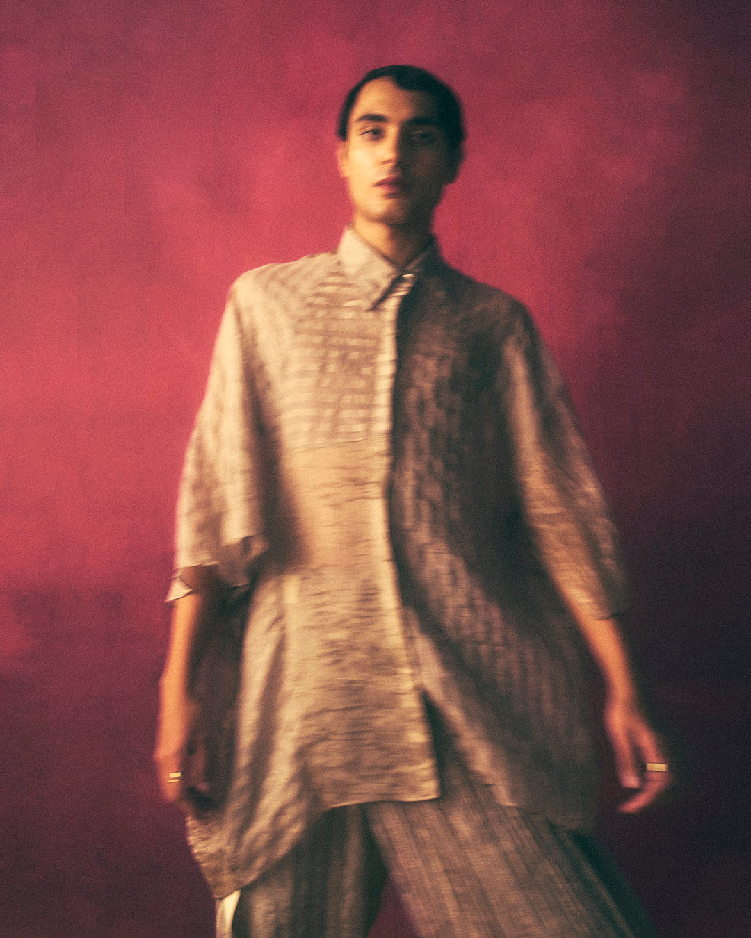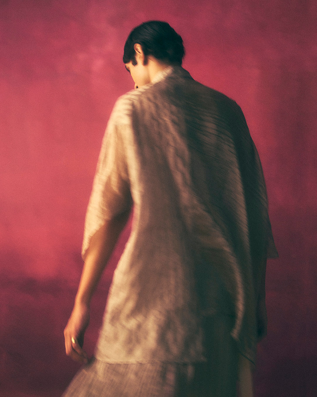 pair with a relaxed ora pants and upcycled brocade hoshi blazer for a complete festive ensemble