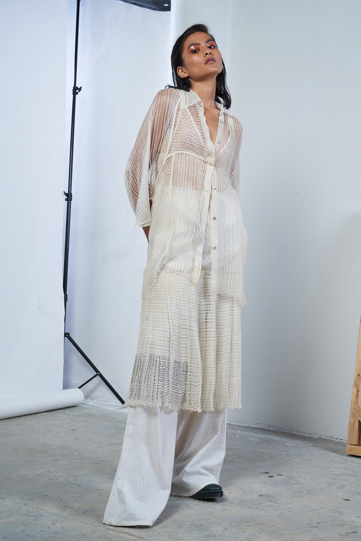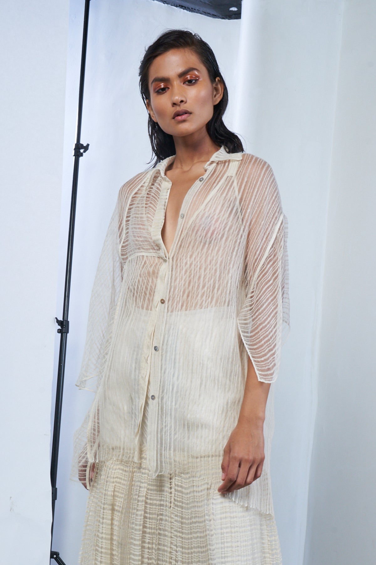 Blockprinted uneven hemline striped shirt in linen noil wear over lounge pants or unbottoned over a shirt or tunic