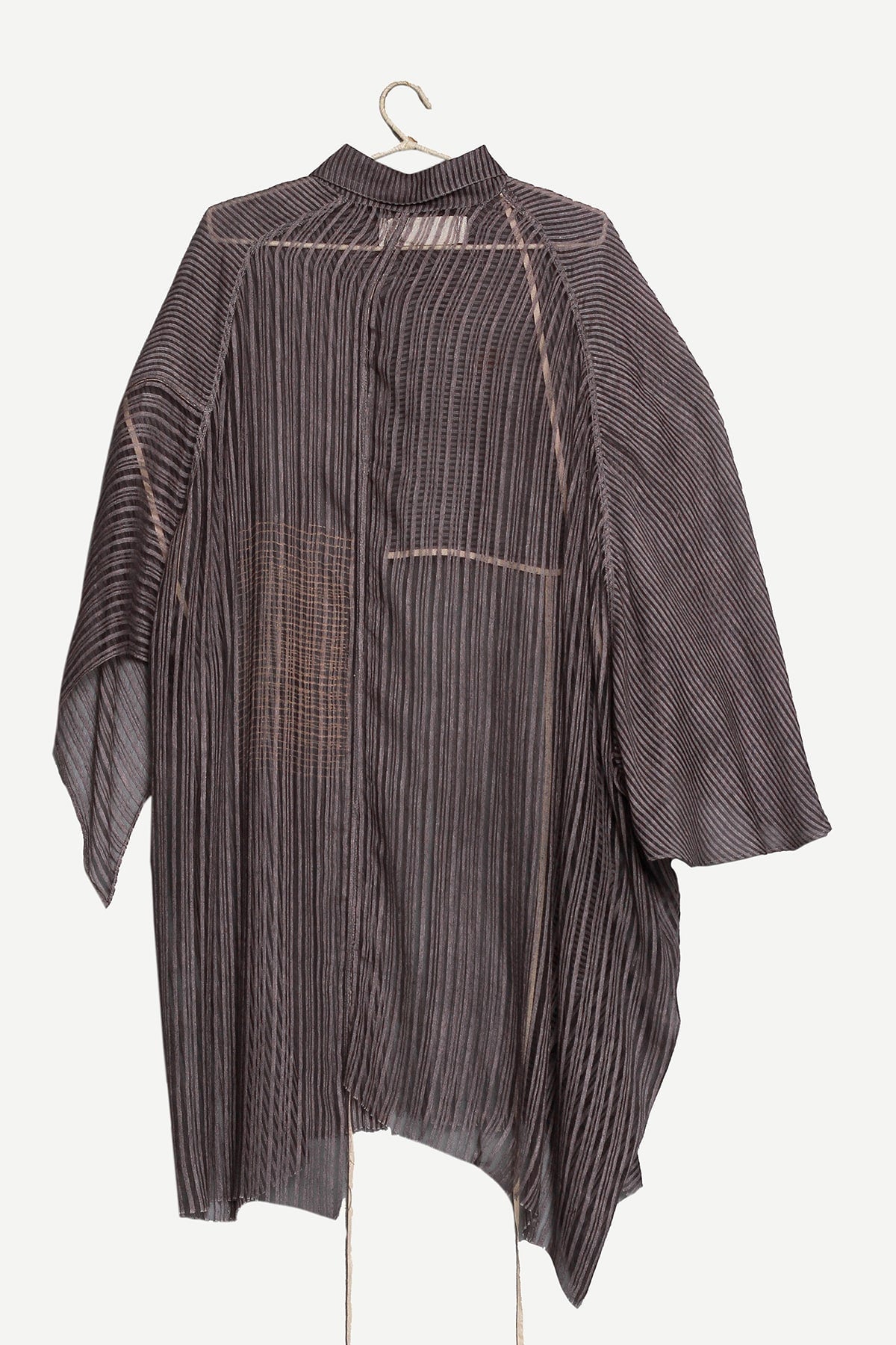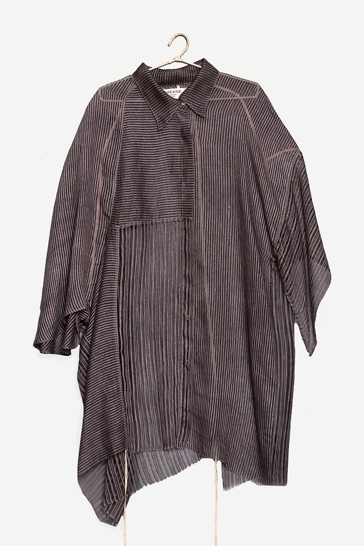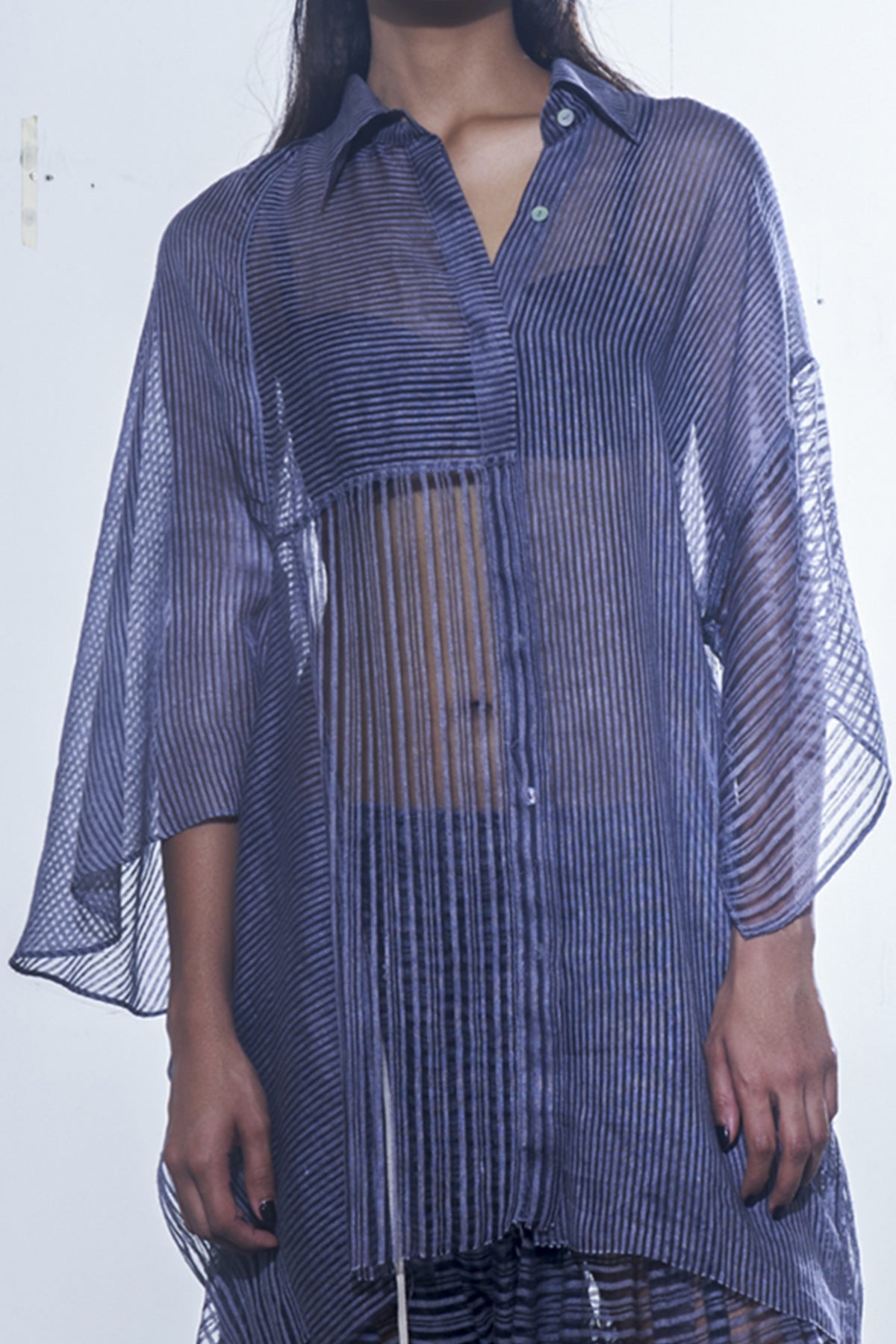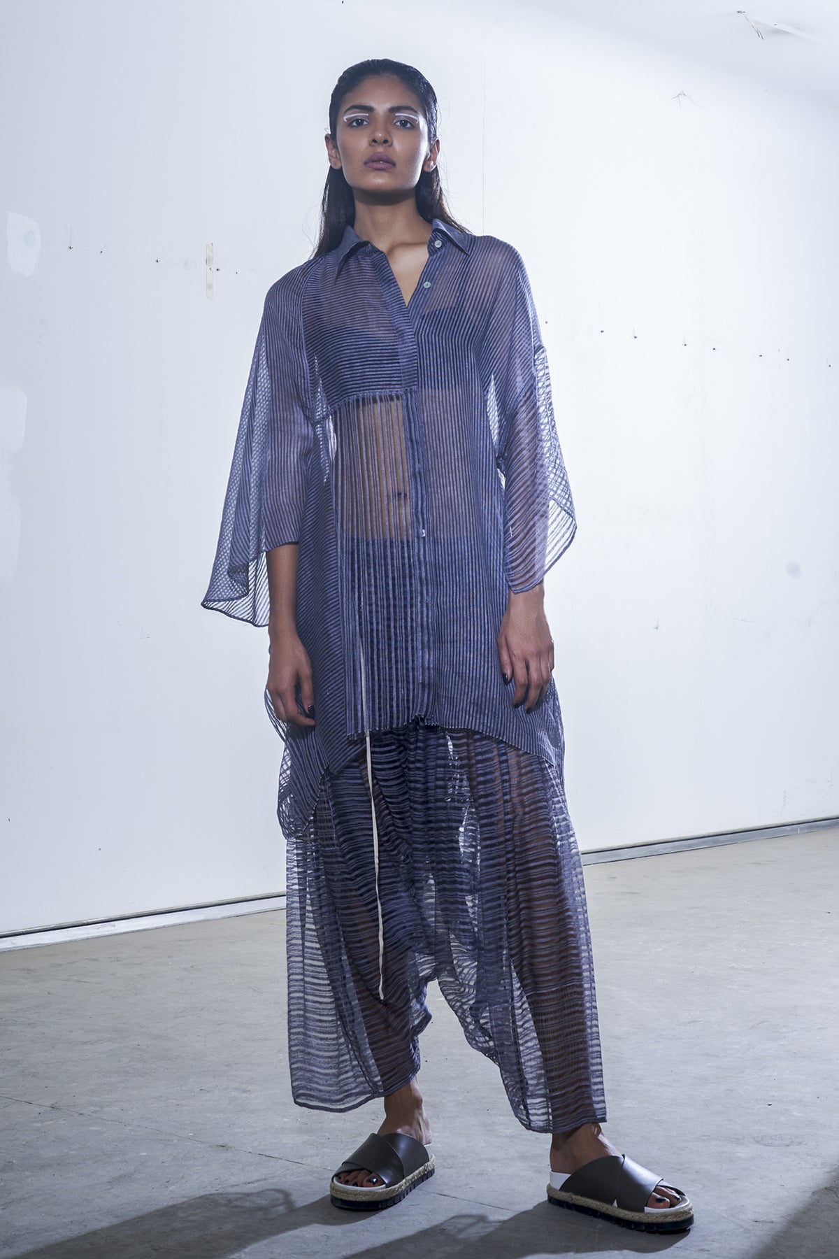 Blockprinted uneven hemline striped shirt in linen noil wear over matching shalwar/ lounge pants for a complete look