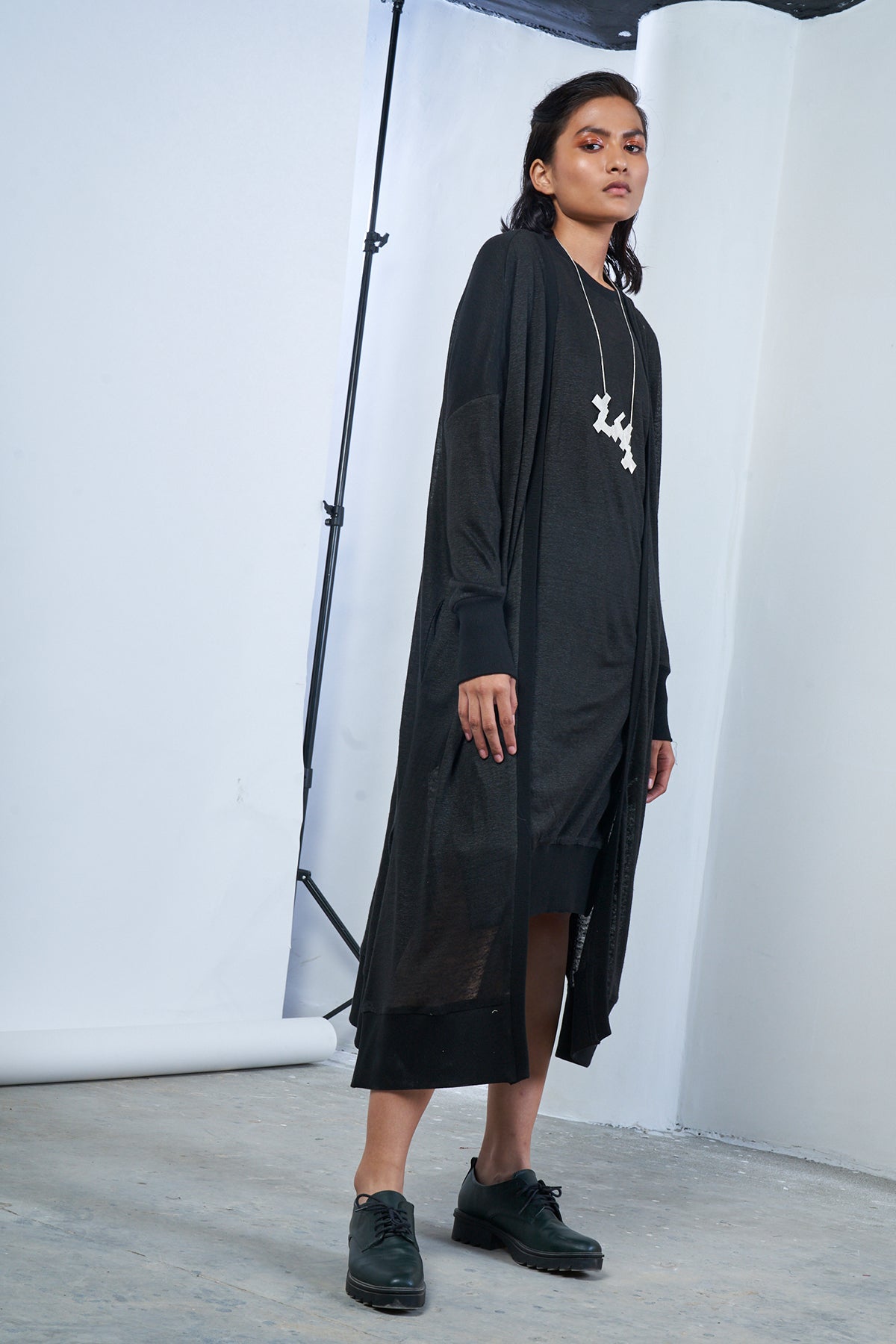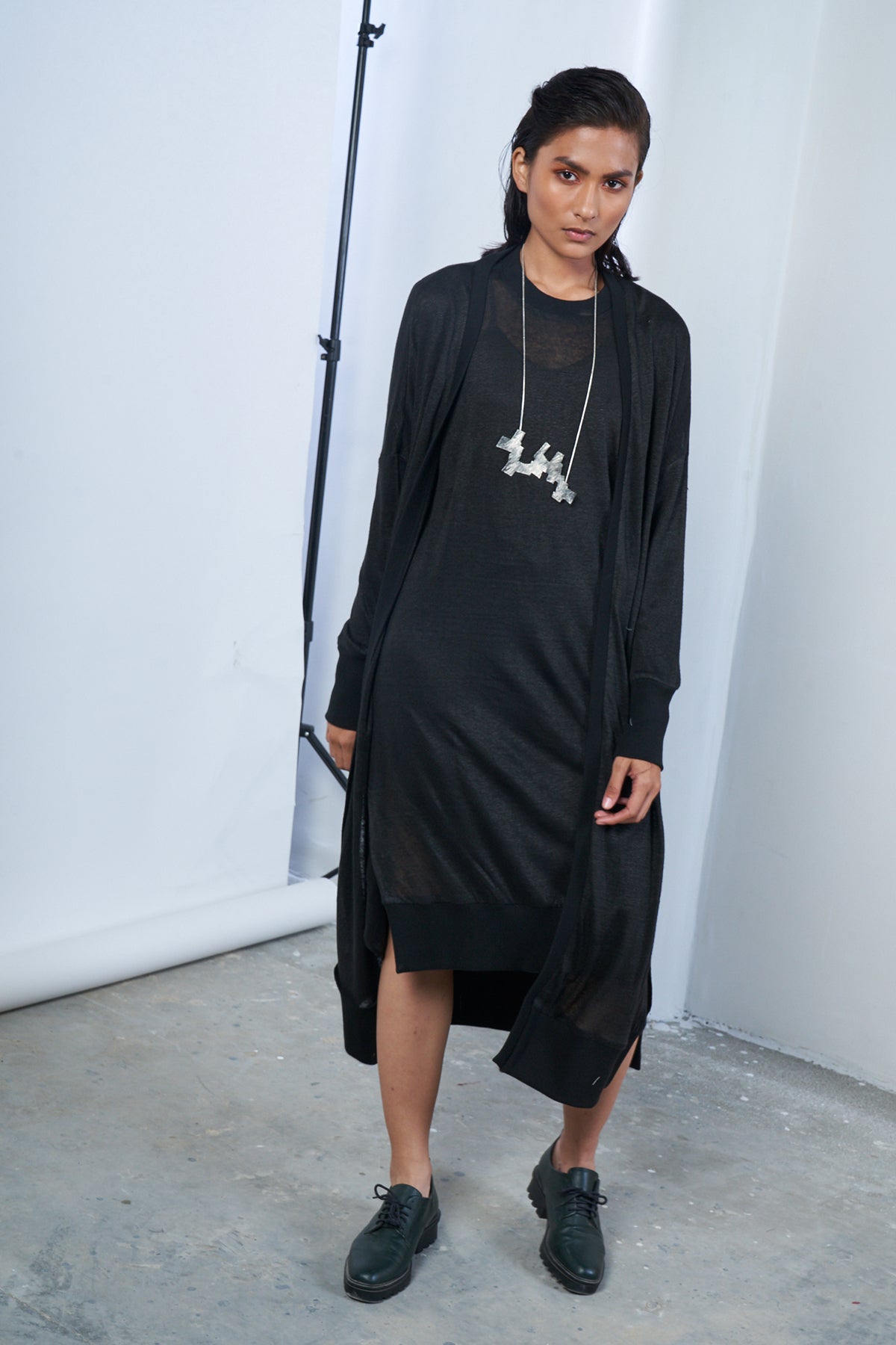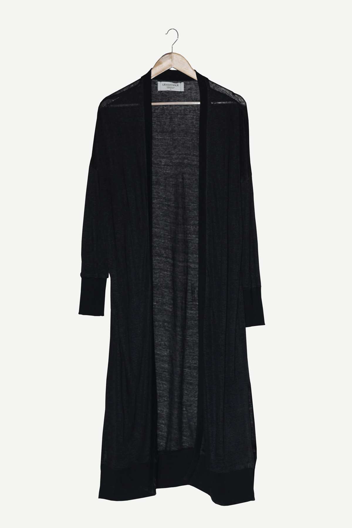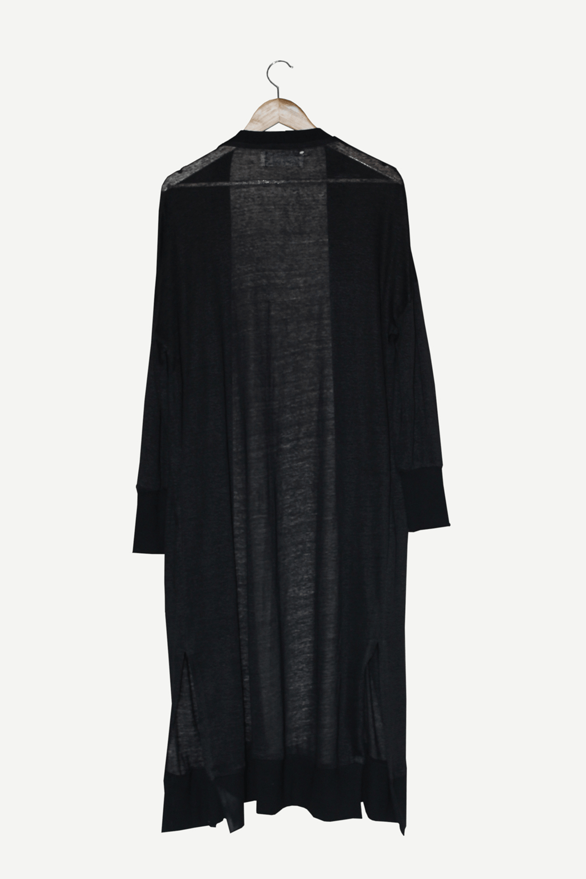 Easy overlay in silk linen jersey with ribbed cotton cuffs and hemline wear over a dress or pair with a top and pants for lounging