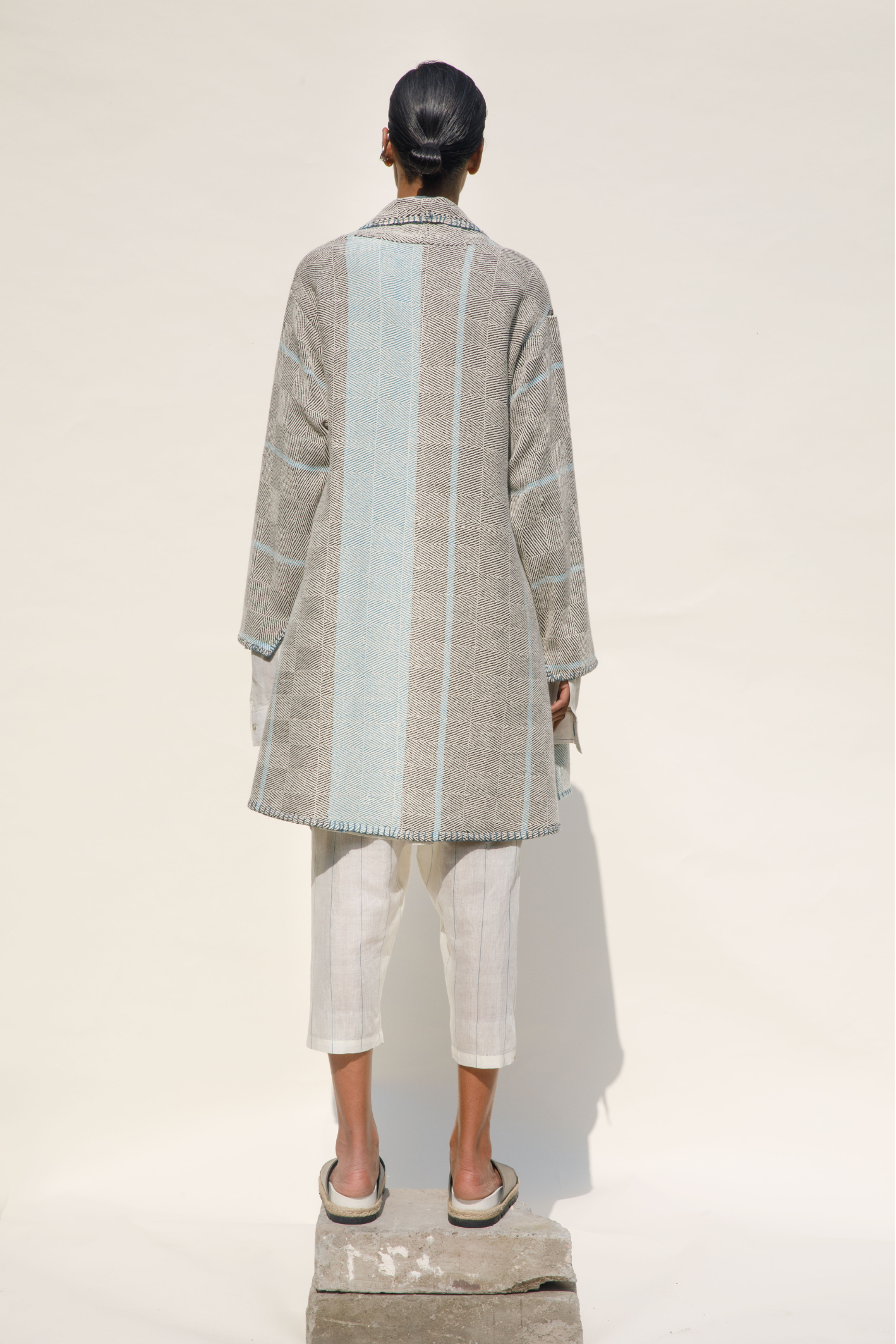 Easy, shawl collar jacket in 100% handloom cotton pair it with a dress or wear over an oversized shirt and lounge pants for a complete look.