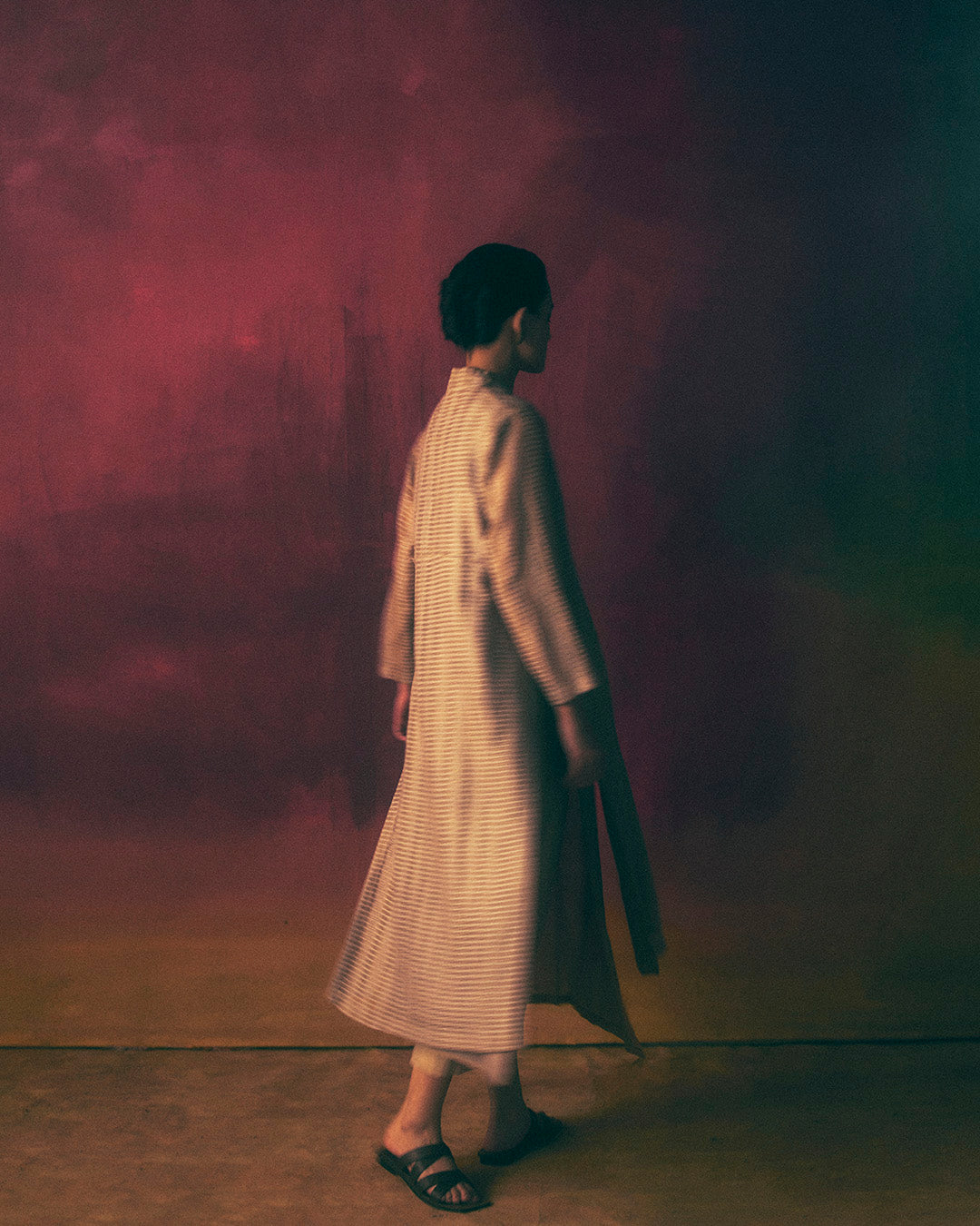 Long-line, form-flattering panelled jacket in textured cotton silk