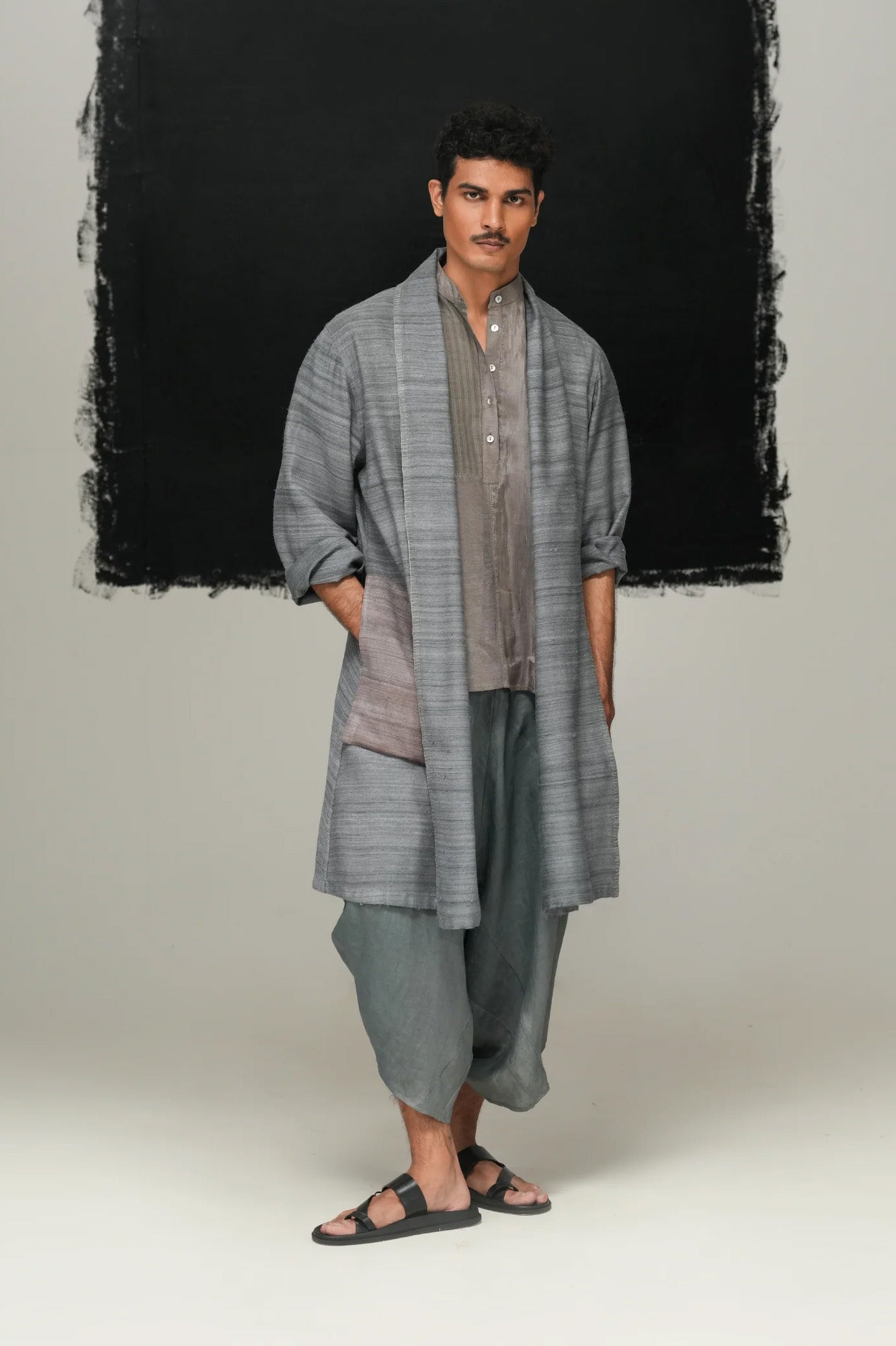 Handwoven Eri silk jacket adorned with intricate chain stitch, designed for ease and movement.