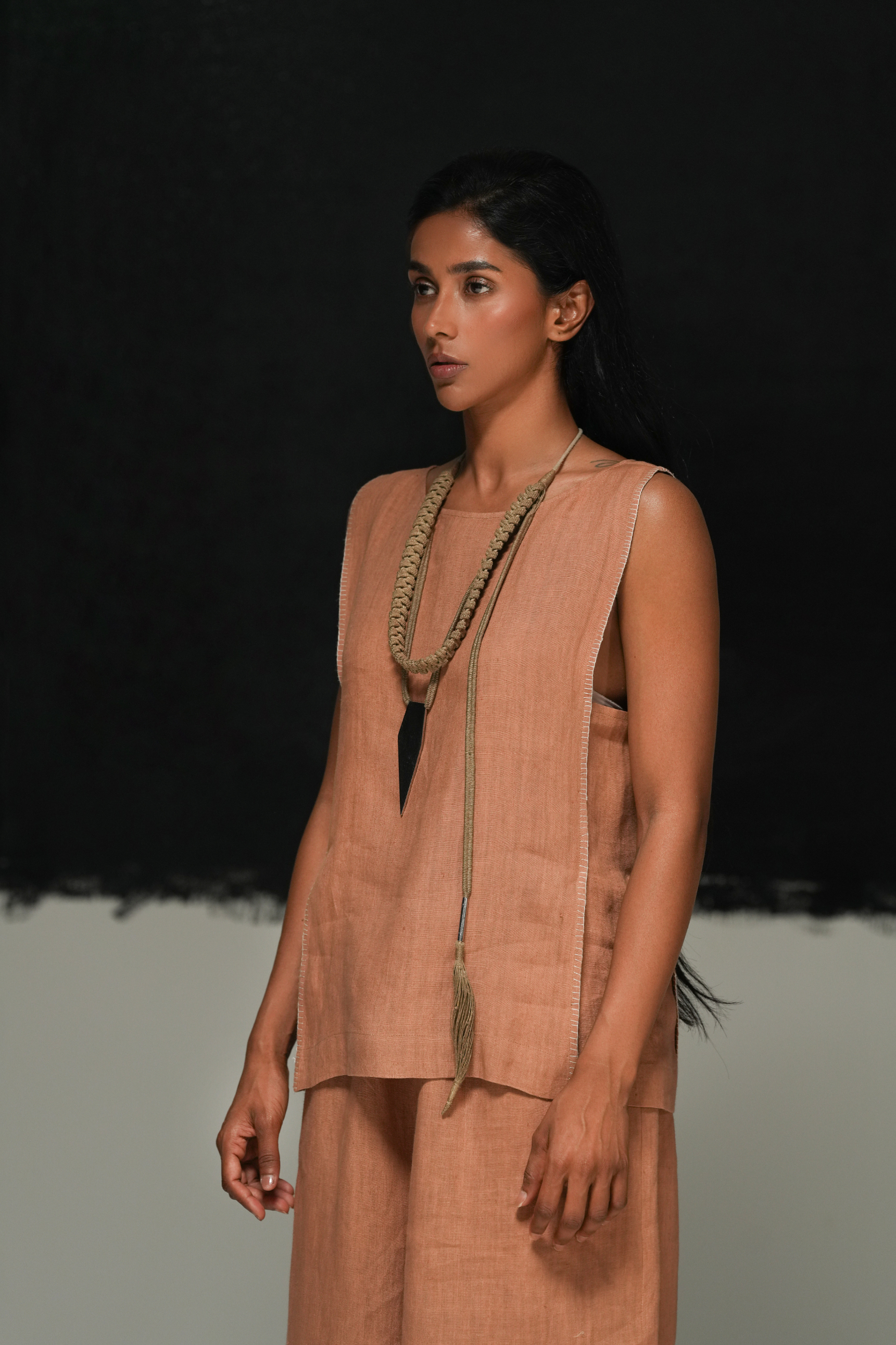 Sleeveless top, crafted in handwoven linen and accented with hand-done chain stitch detailing.
